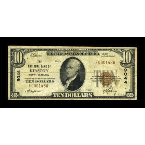 <B>Kinston, NC</B></I> - $10 1929 Ty. 1 <B>The NB of Kinston</B></I> Ch. # 9044<BR> A great new discovery which is unique for the bank, which issued a minimal quantity of small size notes before entering receivership early in 1931. This was the only denomination issued, and, prior to the appearance of this piece, not even a whisper of this note's existence was known. Nice <B>Fine, </B></I>a truly significant North Carolina rarity likely destined for an important North Carolina collection. <BR><BR><b>Shipping:</b> Coins & Currency (<a target="_blank" href="http://www.heritageauctions.com/common/shipping.php">view shipping information</a>)