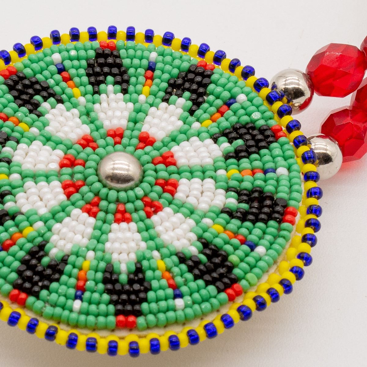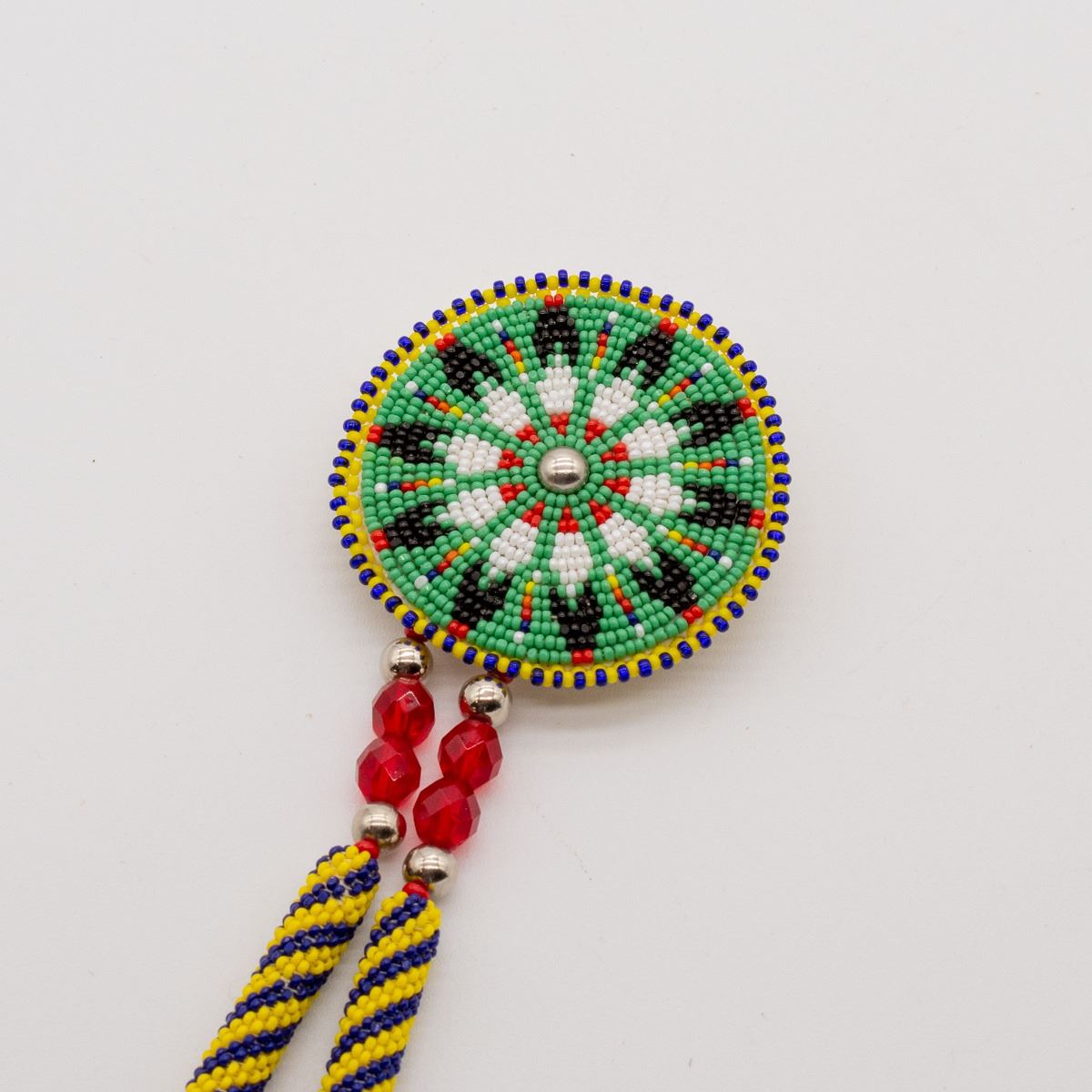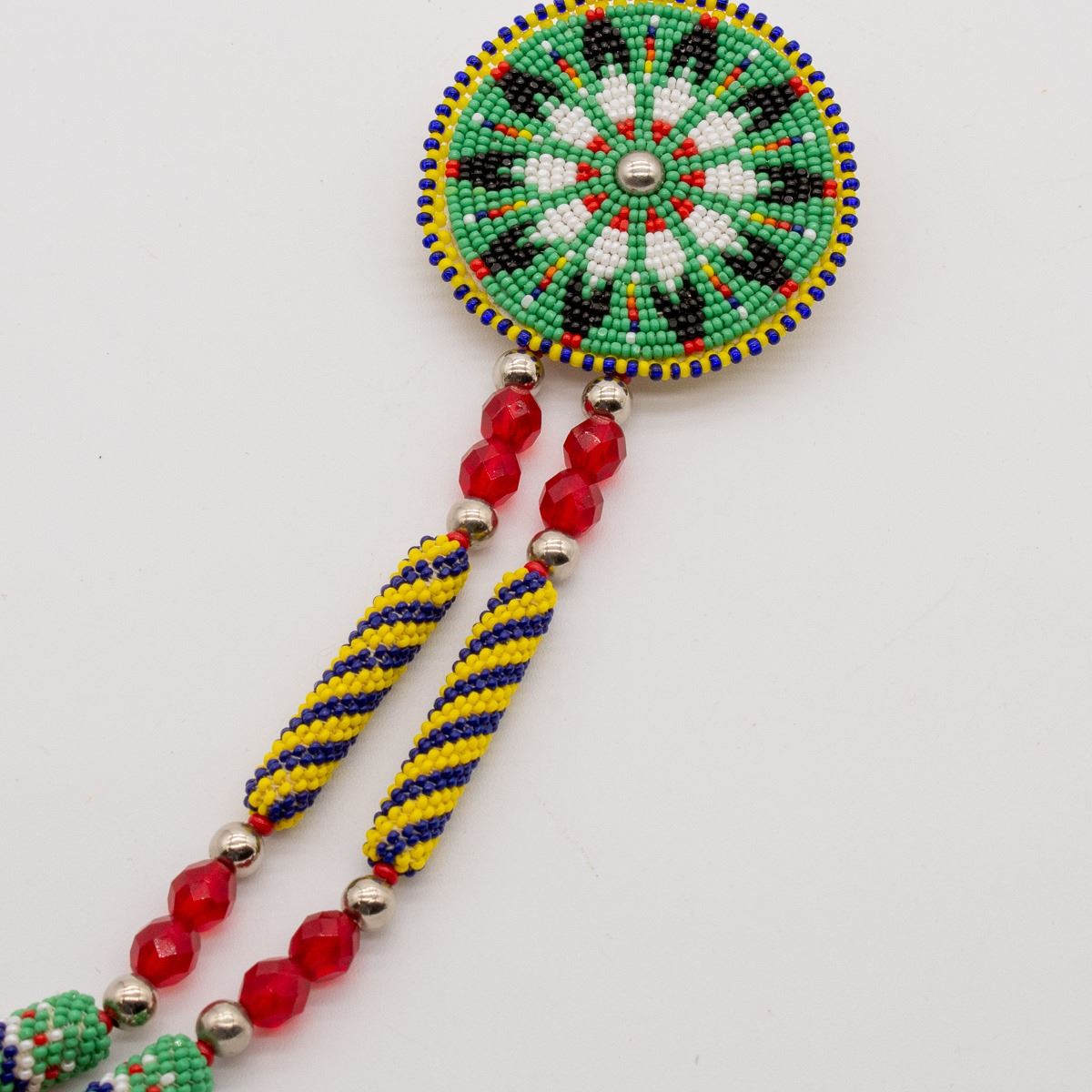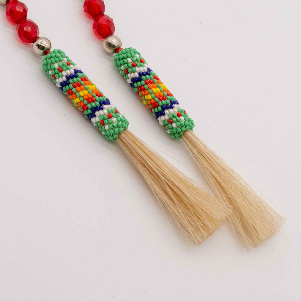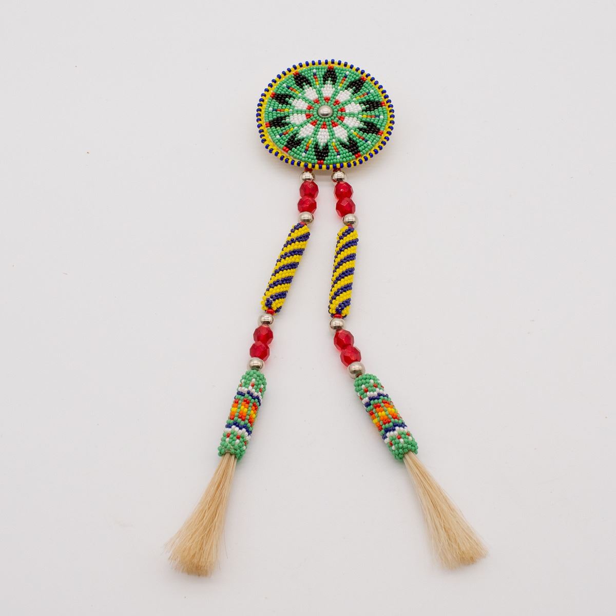 Native American Kiowa Apache Beaded Pin by Richard Aitson, measures 9''L x 2'', horse hair tassels, signed on the bottom, absolutely gorgeous, FYI: ''Aitson's Kiowa name means ''Buffalo Rider.'' His family has had many artistic accomplishments and he comes five generations of respected beadworkers. He was invited to joined the prestigious Kiowa Gourd Clan and had to learn beading to create his gourd dance regalia. He creates beaded dance regalia for the Native American community.''