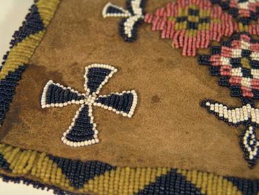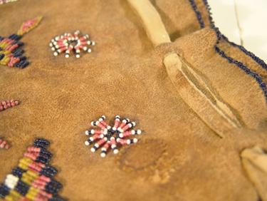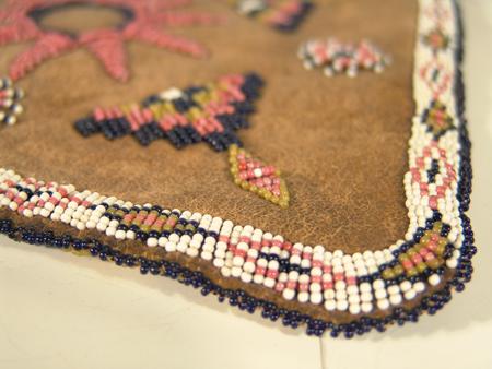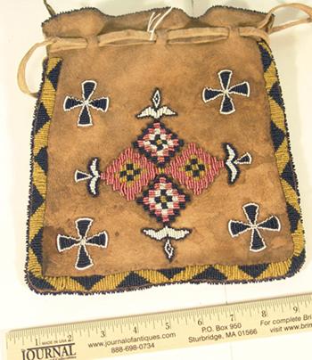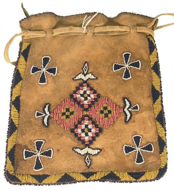 Beautiful two-sided buckskin bag with traditional Southern Plains designs. Condition: very good, shows use. 10" x 8-1/2"