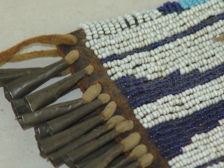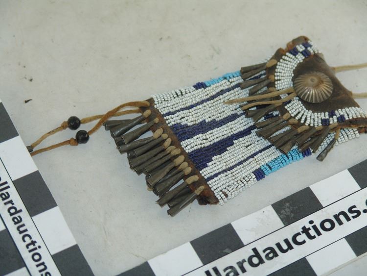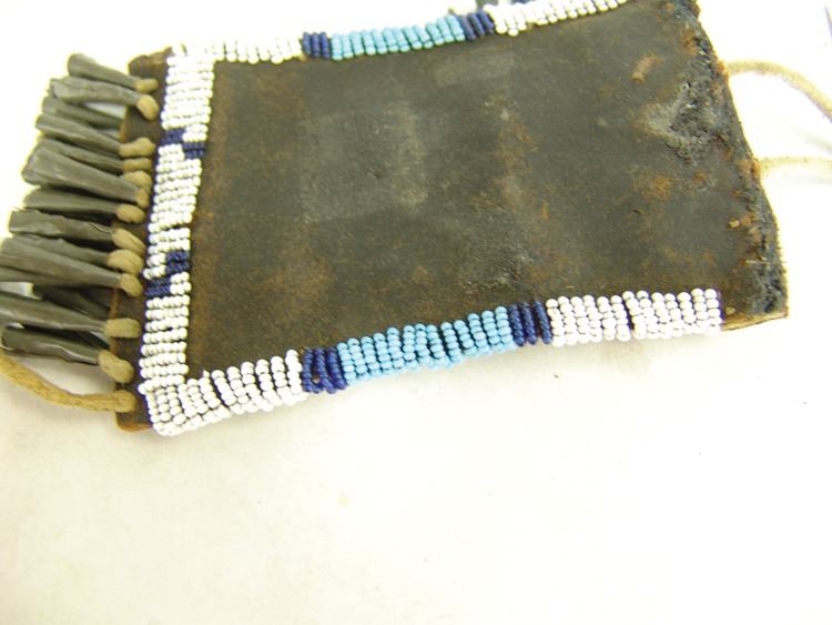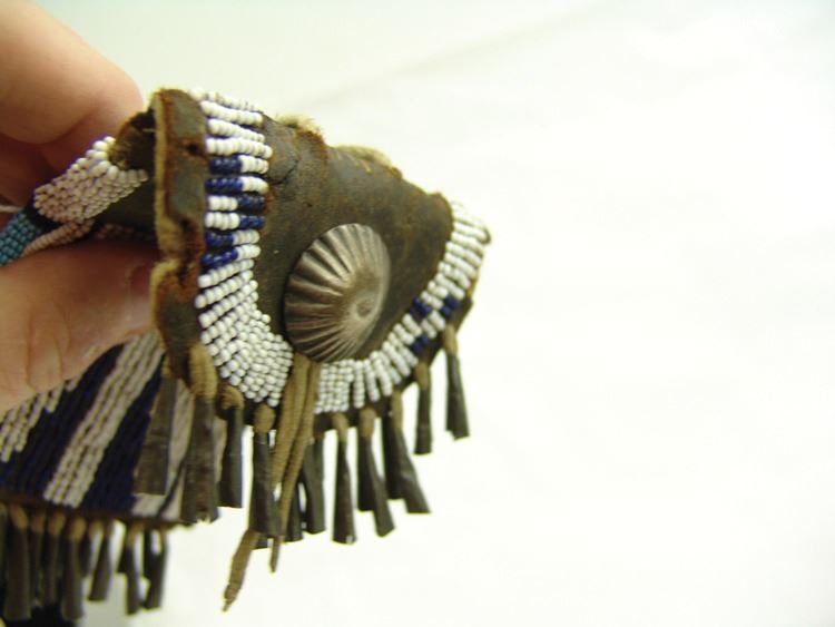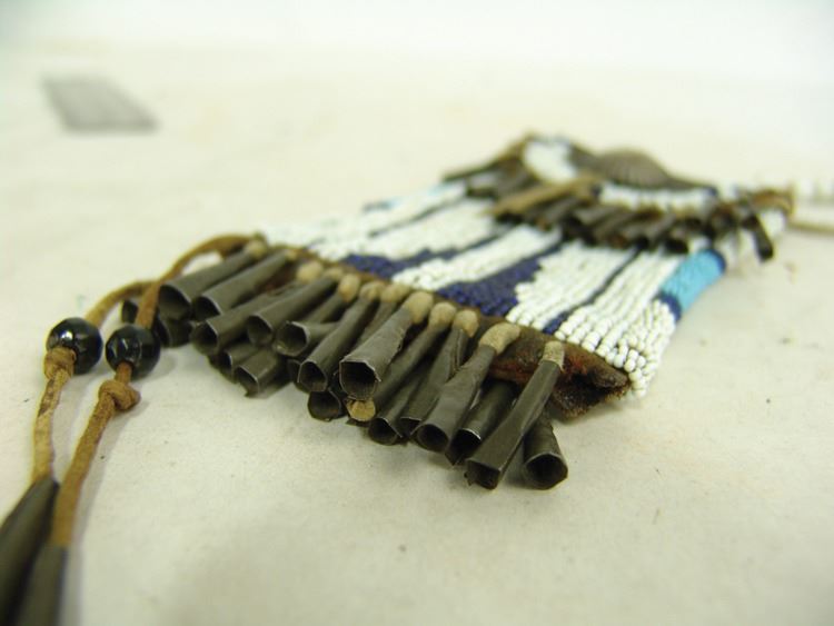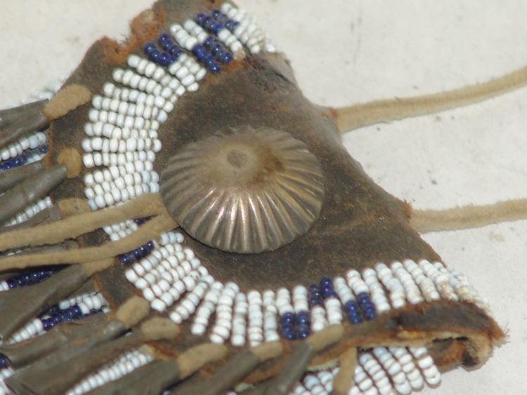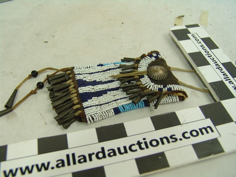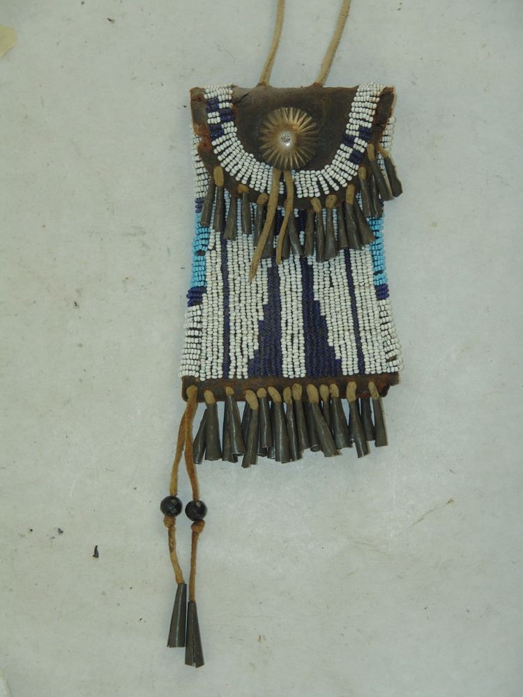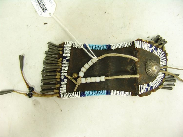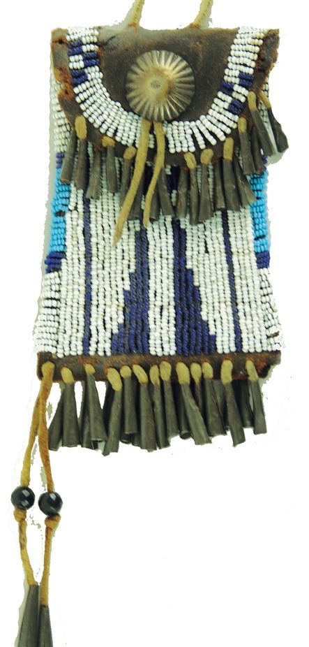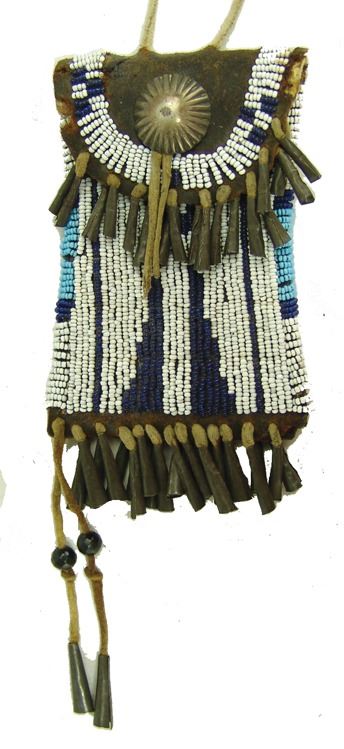 Traditional flared latigo flat bag with lazy stitch beaded designs, tin cone suspensions, and a single silver concho on the front. Done in the old style, very good condition.,Mid/Late 1900s,5" plus fringe (BDWK)