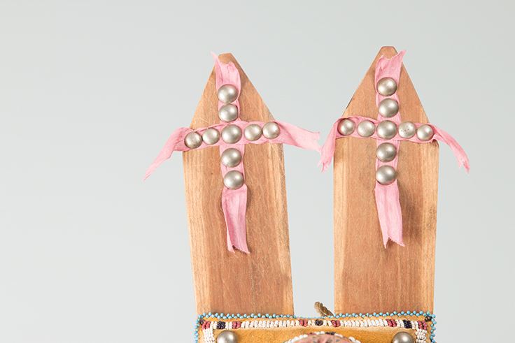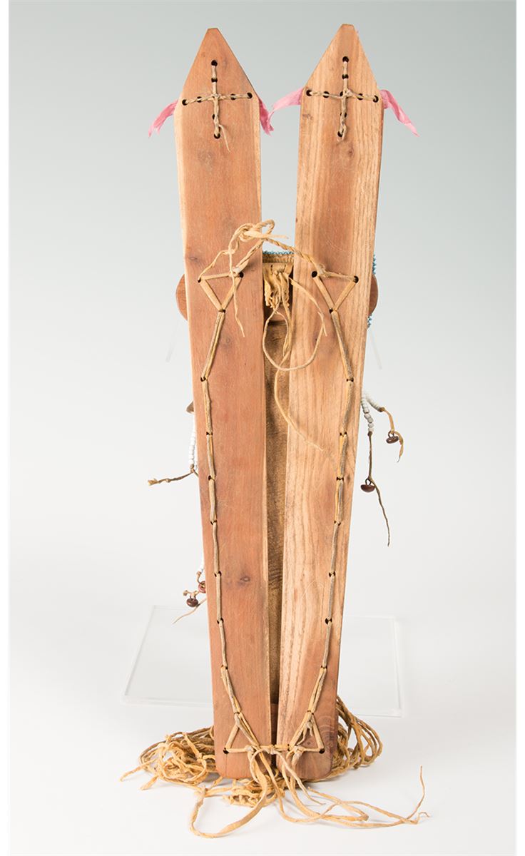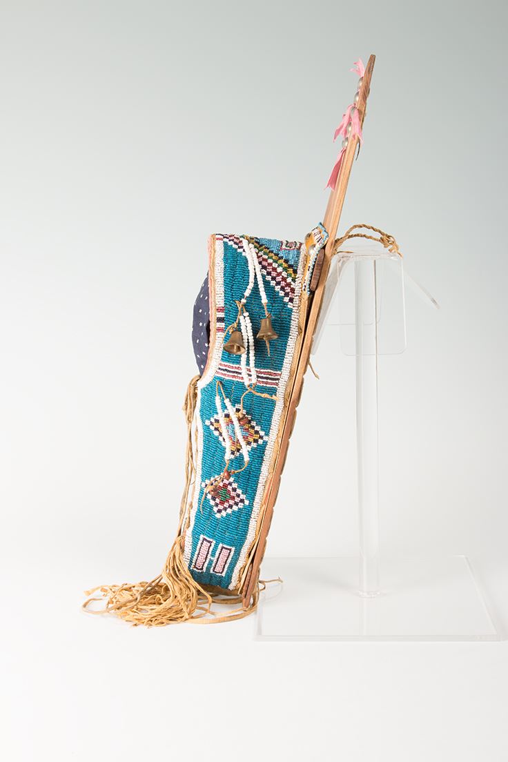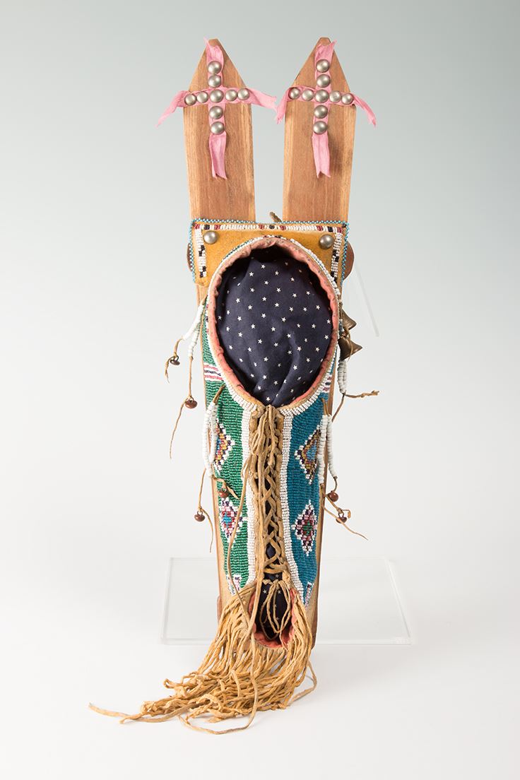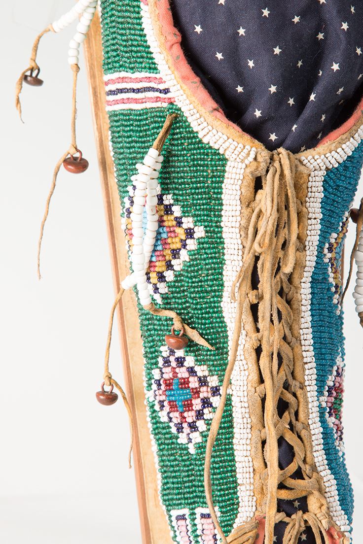 Kiowa Beaded Toy Cradle. 19 ½" long including original, hand-made tacked slats. 5" wide with classic Kiowa bead colors and patterns. Adorned with five drops, one terminating in bells and the others terminating in metal buttons. Lined with trade cloth and bordered with green "lace" beadwork around top panel. Slats are tacked in cross designs and decorated with pink ribbon. Mirror designs from front to back on different colored backgrounds, beaded on yellow ochred hide. Circa early 1900's.