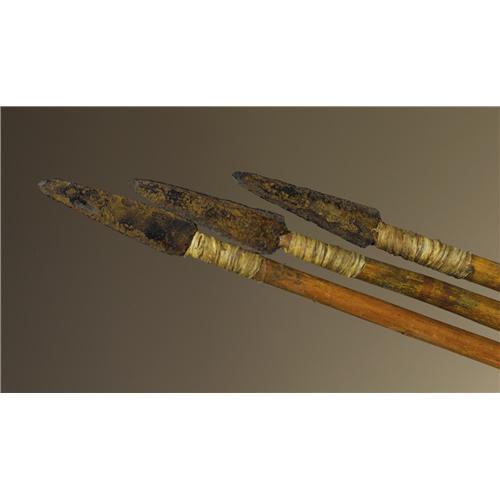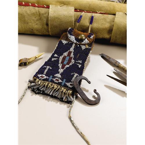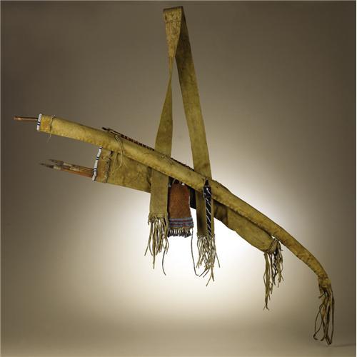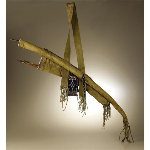 <B>Kiowa Warrior's Bow Case and Quiver</B></I><BR>Circa 1870<BR>Length 54 in.<BR><BR>This classic set is fashioned from native tanned buffalo hide. There is minimal beading at the top of both bow case and quiver. Traces of red and yellow ochre paint remain. A plain wood bow (missing the bowstring) and three iron tipped arrows complete the set. A strike-a-light case is tied to the quiver. It is beaded on saddle leather with a central stepped diamond in red and blue, outlined in white, against a navy blue background. Tin cones further decorate the case and the fringe is wrapped with bands of German silver. A brass concho is fastened to the cover flap. The strike-a-light case holds a firesteel and a carved bone vent pick used to clean a percussion rifle. An awl case, also beaded on saddle leather, is decorated with diagonal stripes in white against a navy blue background and suspended from the set.<BR><BR>Provenance<BR>Tom Haas, Riverton, Utah<BR><BR>Reference<BR>Identical to the set illustrated on page 179 in Steve Alley and Jim Hamm, <I>Encyclopedia of Native American Bows, Arrows, and Quivers, Volume 2, Plains and Southwest.</B></I> Goldthwaite, Texas: Bois d'Arc Press, 2002.<BR><BR> <BR><BR><B>Important noti
