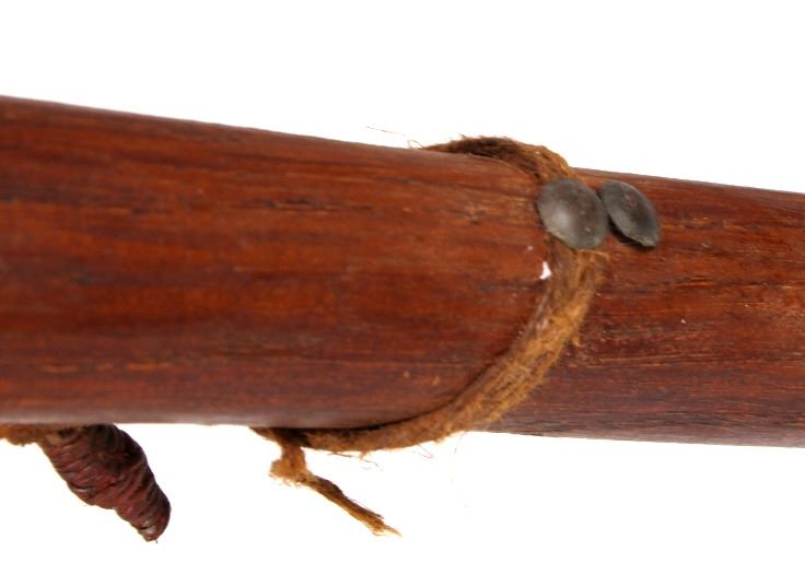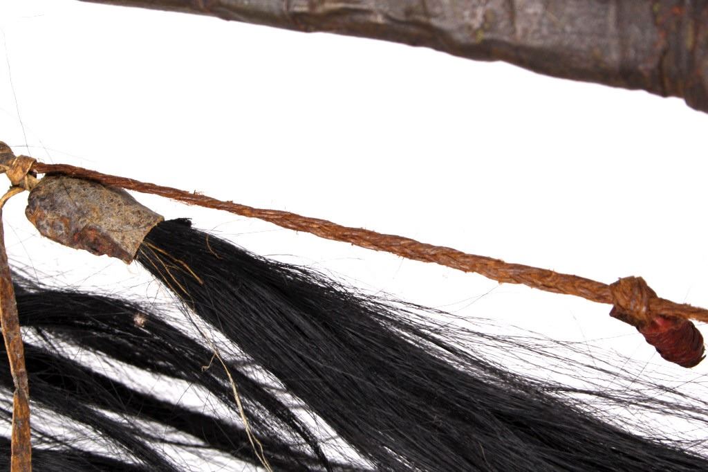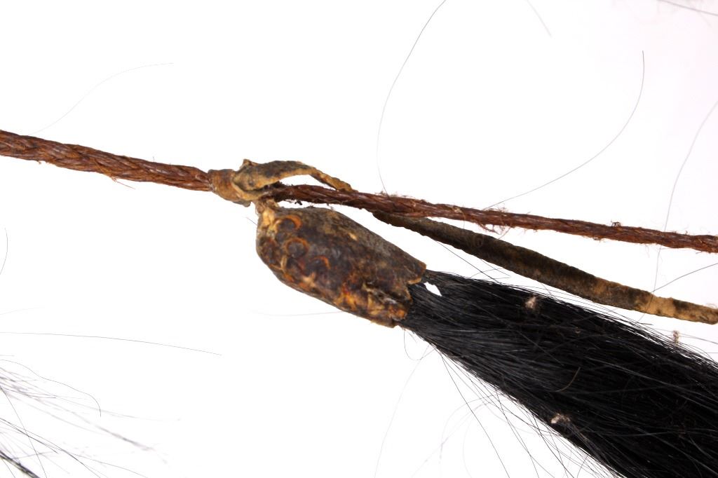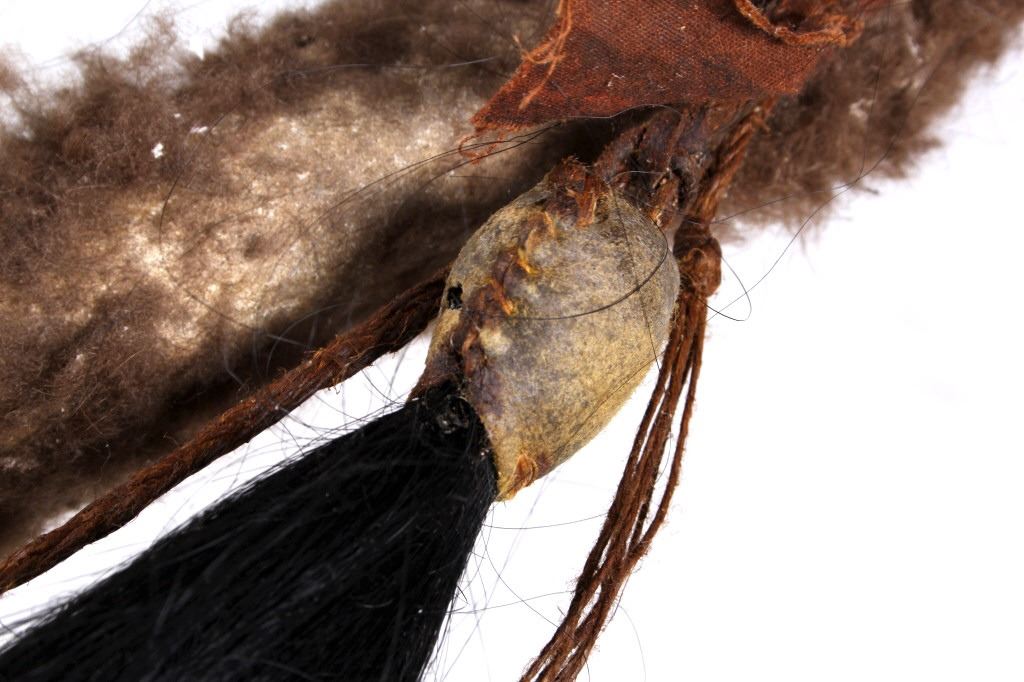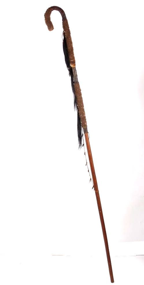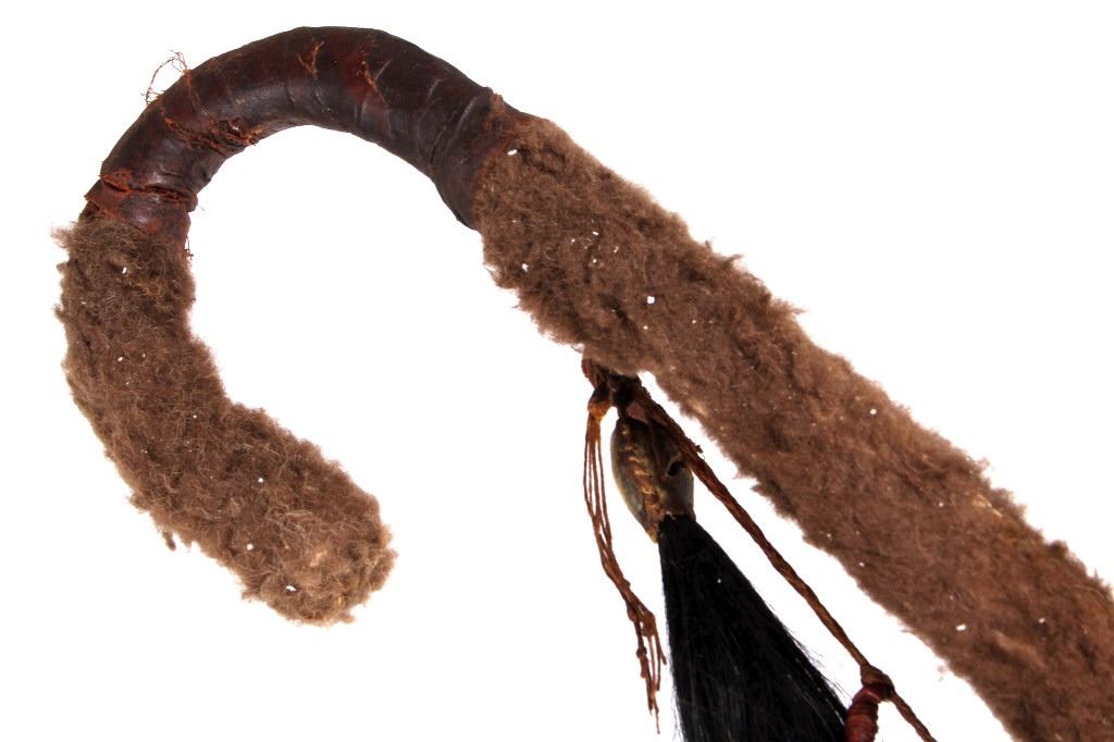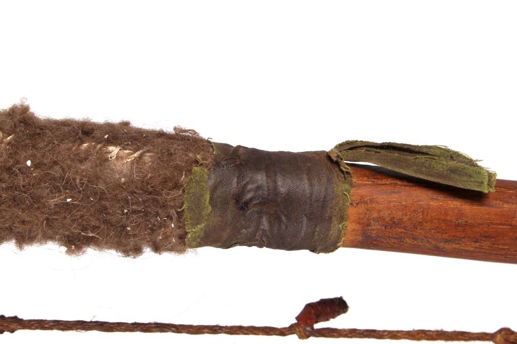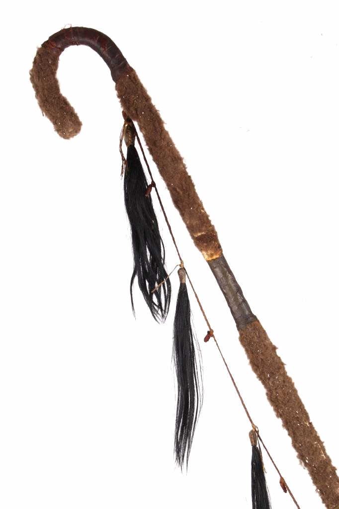 This is a wonderful authentic original Northern Oklahoma Kiowa Native American Indian Coup Staff from the mid to late 19th century. The piece shows a wood construction with Buffalo Bison hide fur wrappings, a Buffalo Hide drop, and a sinew strand along the staff. The staff is truly and excellent museum quality piece and shows overall good condition (staff head is lose). The staff would have been used by one of the Kiowa Warriors on horse back to practice warfare. The end would have been used to bring down the other opponent. Provenance: From a large private museum collection in Missouri, the same collection as the Northern Plains Wolf Scout cap that we sold for $4,165 at our 1/16/16 auction. The Warriors Coup Stick originally showed Golden Eagle Feathers (indicative of its very early authentic age), which were removed for sale. Measures overall "L.