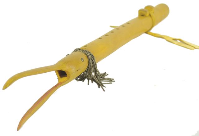 Early/Mid 1900s, Rare hand carved bird effigy (screaming eagle) flute, painted with yellow and red ochre, with brass tack eyes and metal military epaulet braid collar; all original. 24"