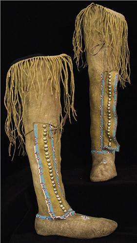 Kiowa Hightop Moccasins. 19" tall. Knee length boots with typical Kiowa style beadwork. German silver conchos. Yellow ochre stain. C.1880s. Fine condition. (est $5,000-6,000).