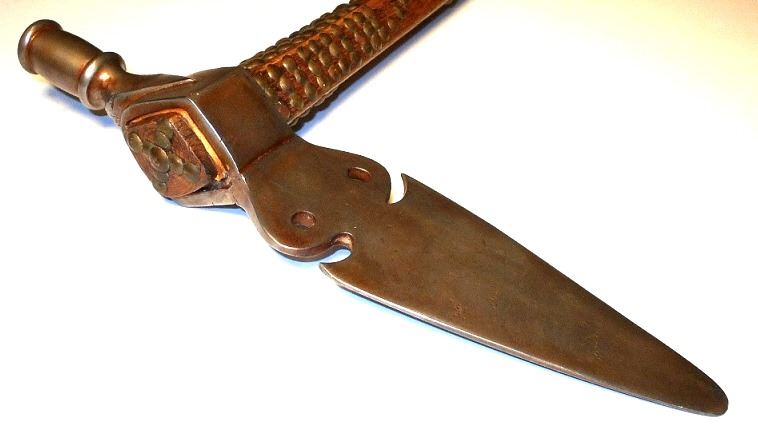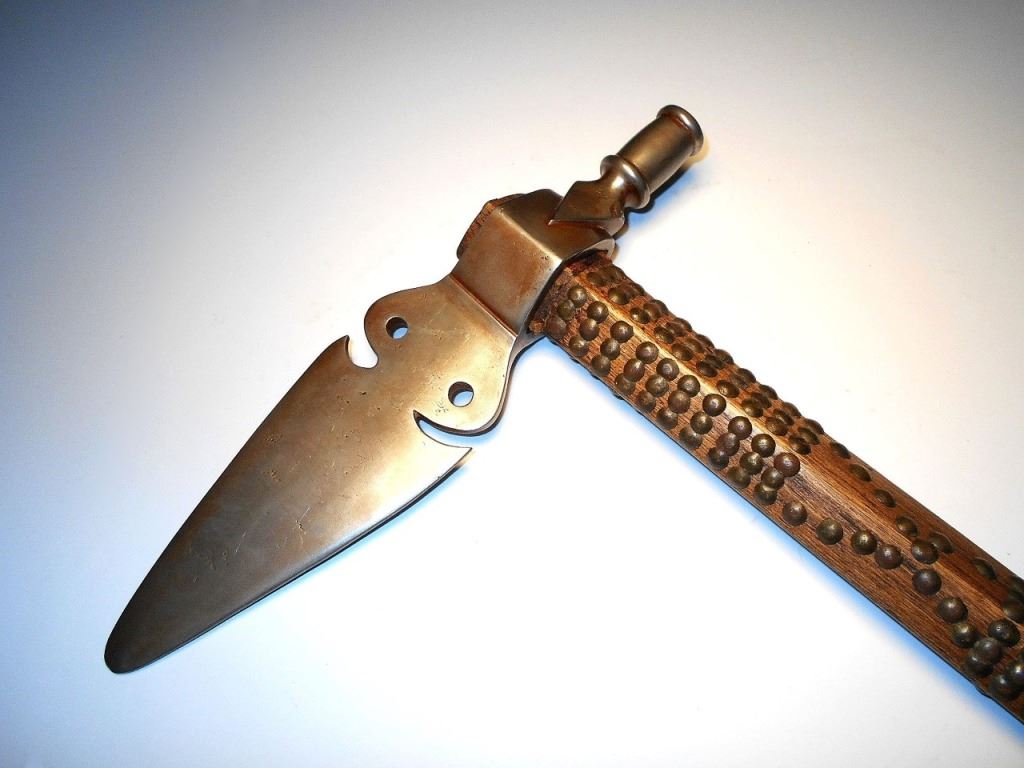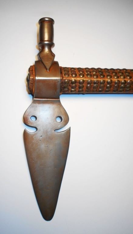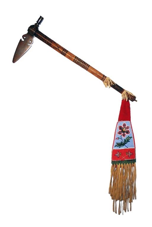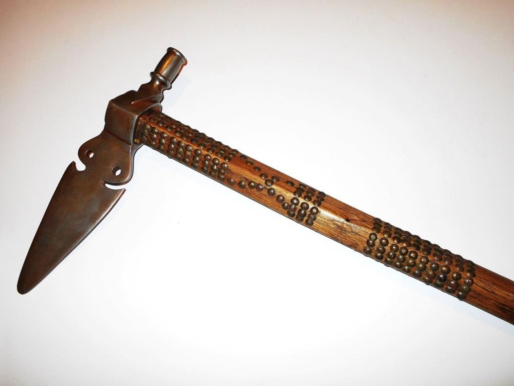 This is an extraordinary authentic circa 1860-1970’s spontoon pipe tomahawk attributed to the Kiowa Native American Indians of the lower Southern Plains. This identical example of spontoon head has been documented as being an authentic example by authors Green, Baldwin, Francis, Hartzler & Knowles and Peterson all four pieces being attributed to the Kiowa Indians, all on long hafts such as this example and all possibly being from the same maker. This example features a hand-forged spontoon head with high polished with rich patina natural finish accented by the two pierced lobes, a tapered & pointed blade. The tomahawk shows a diamond-shaped eyelet hole, which helps date the piece properly to the 1860-1870’s Indian Wars era. The piece is married to a solid wood haft handle which is elaborately adorned with hundreds of brass trade tacks in a linear and geometric design along with two old strips of Indian tanned hide fringe gaskets at the gripping area, which has some discoloration from age and use. The smoking tip is an old bullet cartridge. The tomahawk is also adorned with a typical shaped beaded drop attached that is comprised of old stroud clothe, Buffalo hide fringe and trade clothe with glass trade seed beadwork in a whimsical floral design. The beadwork shows a sky light padre blue background with chalk white border also showing green, greasy yellow, cobalt and rose. Truly a wonderful authentic example in fine preserved condition. Overall the piece measures 28 inches in length with a head that is 11 ½ inches in length and a beaded drop that hangs 27 inches long.
