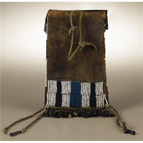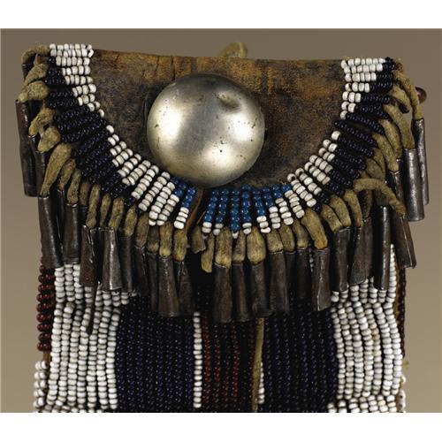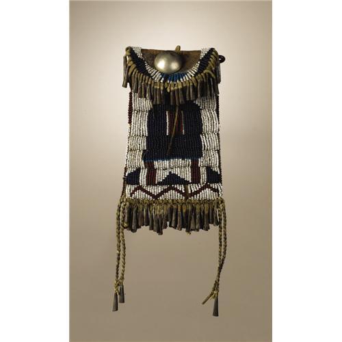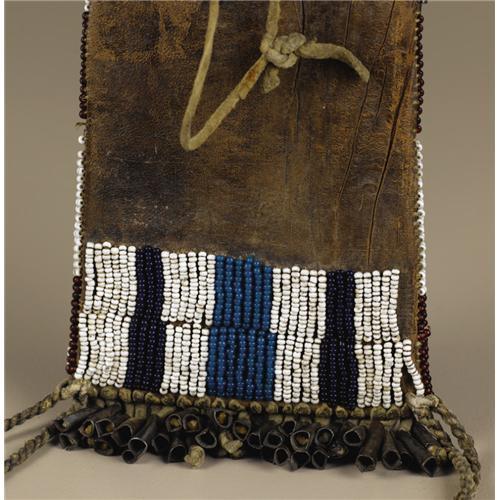 <B>Kiowa Strike-A-Light Case collected from the Cheyenne Chief White Horse</B></I><BR>Circa 1880<BR>Length 9 1/2 in. overall; Length 6 1/4 in. case proper<BR><BR>This classic example is beaded on saddle leather with geometric designs including a "house" pattern in navy blue with a red "door". In addition, there are triangles done in navy blue and a zigzag band done in cranberry red, all against the white bead background. The cover flap is decorated with a German silver concho and tin cone fringe. The bottom is decorated with tin cones and twisted fringe. The reverse has two lanes of beadwork along the bottom.<BR>Aside from their utilitarian function, strike-a-light cases and awl cases were popular costume accessories. Kiowa beadworkers excelled at making these small masterpieces. Men often tied them to their bow case and quiver sets (see Lot 48152). Girls and women used them as belt ornaments and they can be noted in historic photographs (see Lot 48227).<BR><BR>Provenance<BR>Purchased from White Horse, a Cheyenne Indian, along the Cimarron River in Oklahoma by H.C. Schilling in January, 1890. Schilling was from Rogers, Arkansas, and hunted in Indian Territory. A letter dated January 25, 1890 written from Guthrie, Indian Territory, detailing the collecting circumstances and signed by Schilling accompanies this lot. The Cheyenne Chief White Horse was a signatory to the Medicine Lodge Treaty of 1867.<BR><BR>