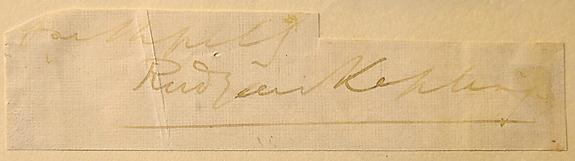 Kipling, Rudyard (1865-1936) English author and poet. Signature on a 1 x 3¾". slip of paper, cut from a document, n.p., n.d. Very good; signature is on the light side but legible. Matted with an image and framed to an overall size of 14 x 10". Some nicks to frame.