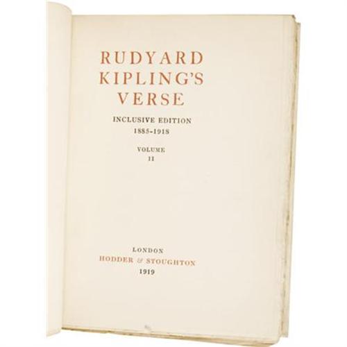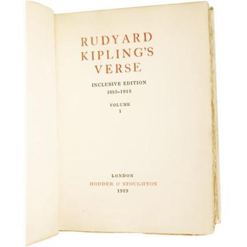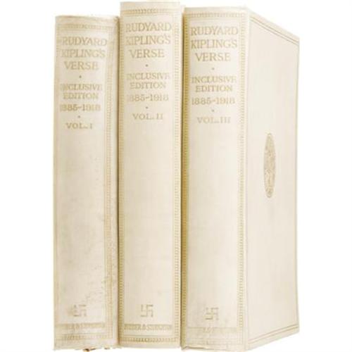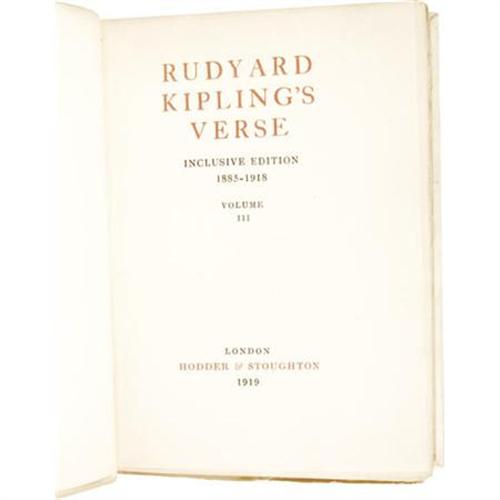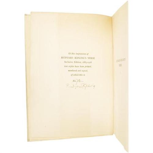 <B>Rudyard Kipling: Signed Three-Volume Set of </B></I><B><I>Rudyard Kipling’s Verse: Inclusive Edition 1885-1918</B></I></B></I> (London: Hodder and Stoughton, 1919), limited edition, number 74 of 100, in three volumes, 318, 324 and 292 pages, gilt top edges, other edges untrimmed, cream-colored vellum bindings with gold lettering and decorations, 8vo (6.25” x 8.5”). One of the most popular writers in the English language, Rudyard Kipling (1865-1936) signed all three volumes of this limited three-volume edition of his poetry, which includes <I>The Jungle Books</B></I>, the <I>Just So Stories</B></I>, “Gunga Din,” and many other beloved classics. Many signed multi-volume limited editions include the author’s autograph in the first book only, but this set has Kipling’s signature opposite the half-title page in all three! The books are in good condition with moderate wear and some warping on the covers; the signature page in volume three has come loose from the binding.<BR><BR><b>Shipping:</b> Books & Catalogs (<a target="_blank" href="http://www.heritageauctions.com/common/shipping.php">view shipping information</a>)