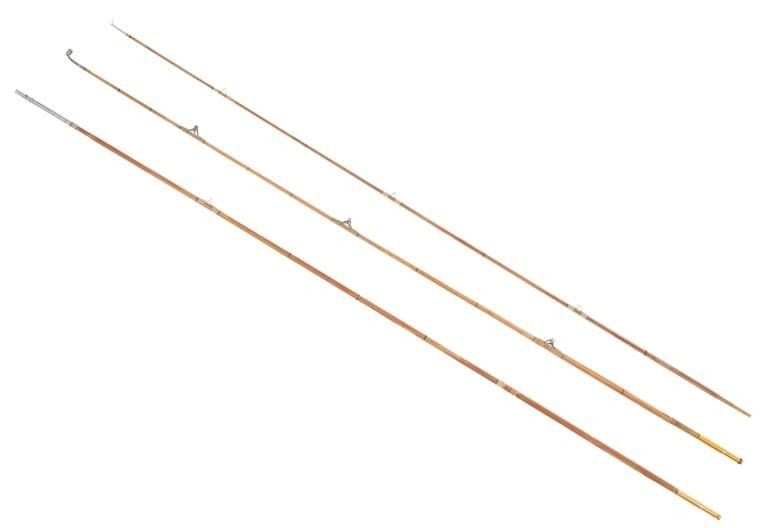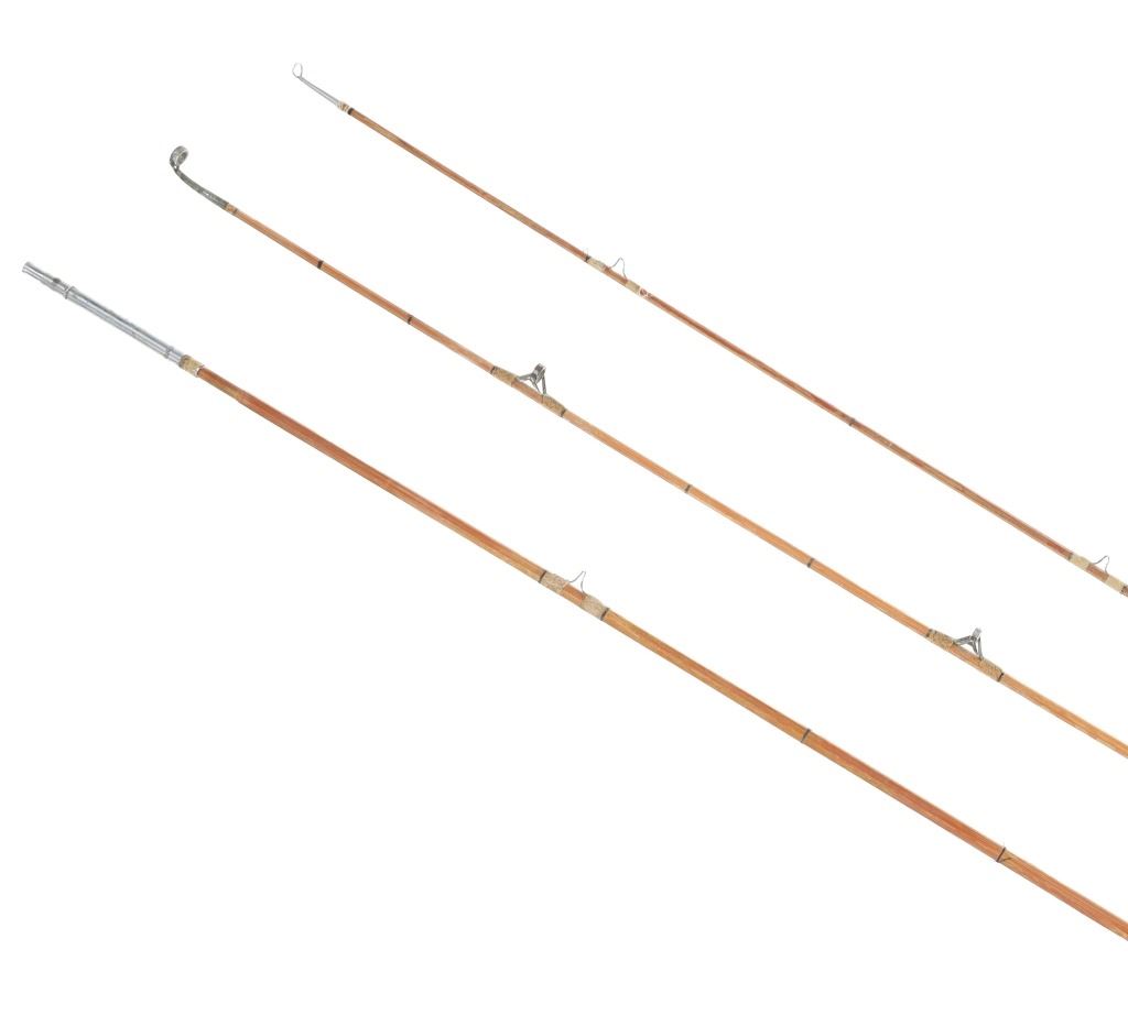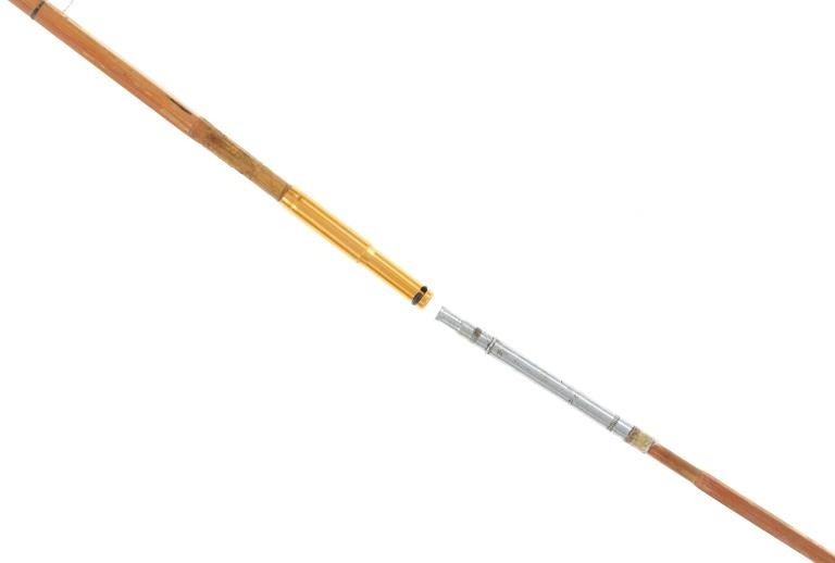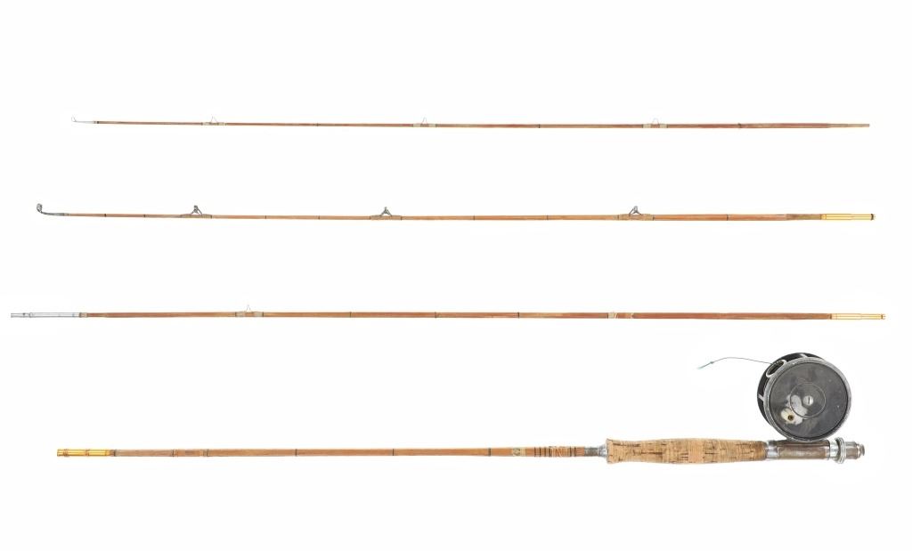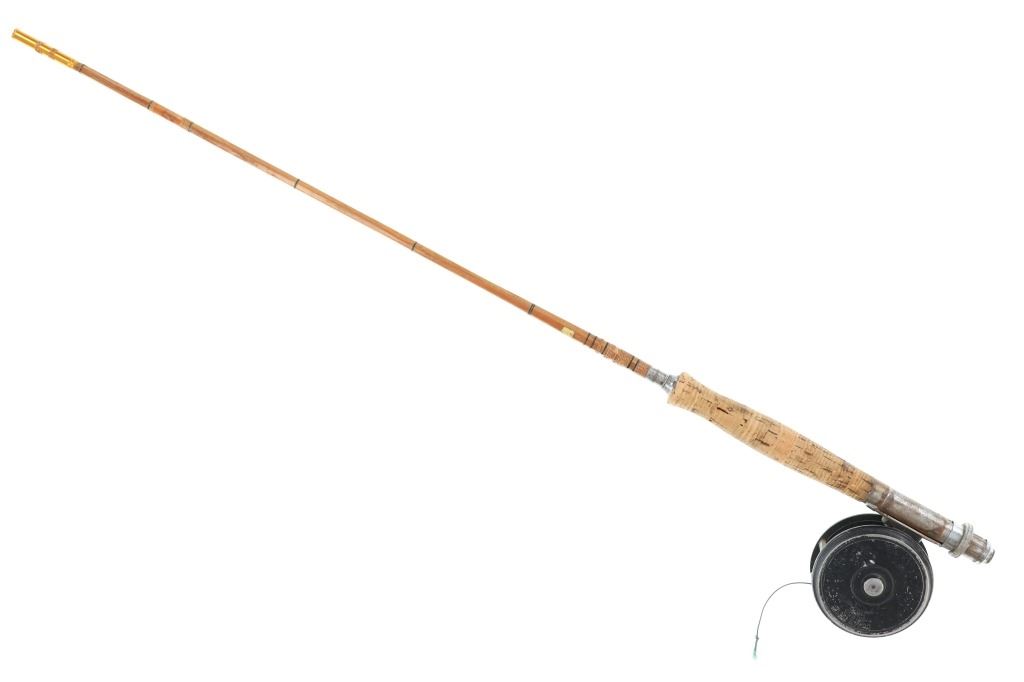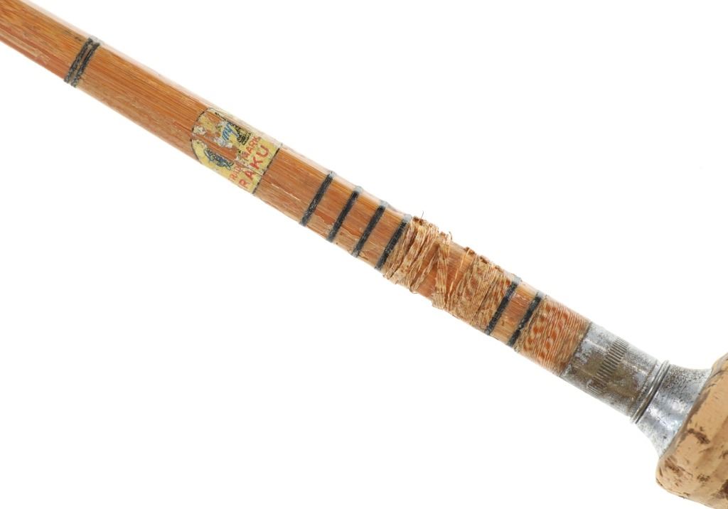Featured in this lot is this Kiraku and Co. Grampus Tokyo, Japan circa 1950's. The fly rod is a segmented rod constructed from bamboo and shows a reel with a three piece segmented set up and a two piece segmented set up. The condition of this fly rod is preserved with some of the female tubes of the rod shaft loose on the rod and shows some wear to the wrapping and wear to the rod itself but otherwise shows preserved condition. The measurements of this fly rod is 8ft with the longer rod and 5 1/2ft for the shorter rod. The collective weight of this fly rod with all the shafts is 12oz.