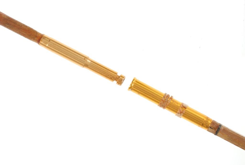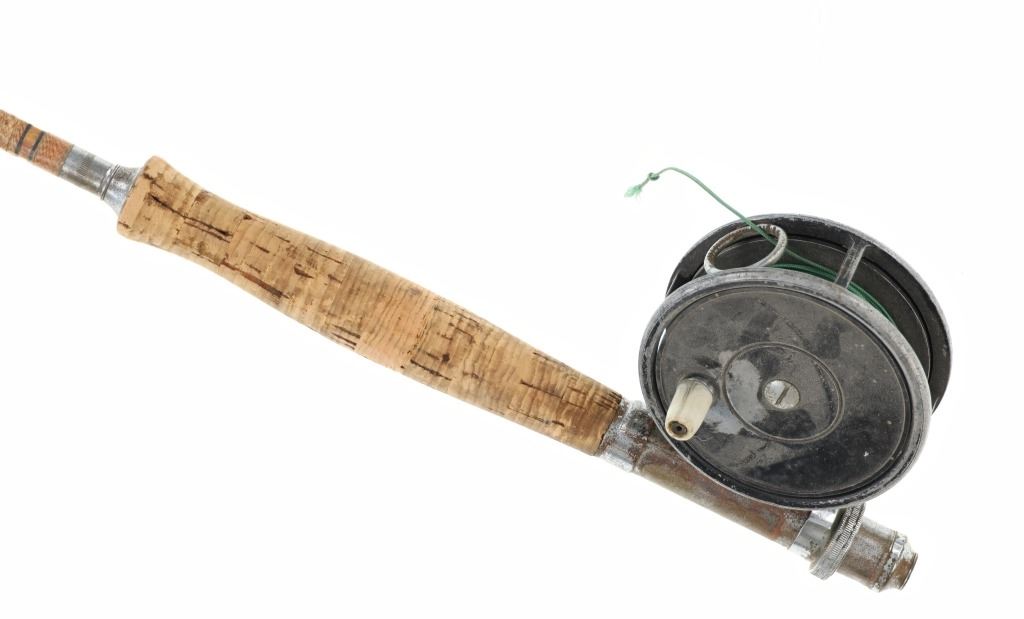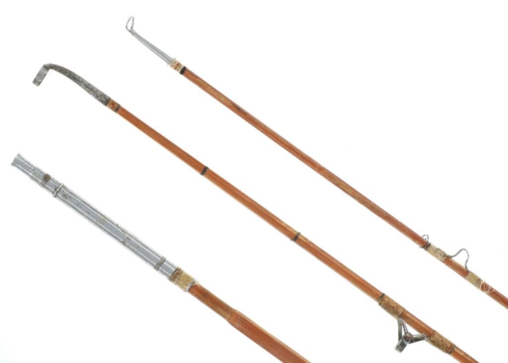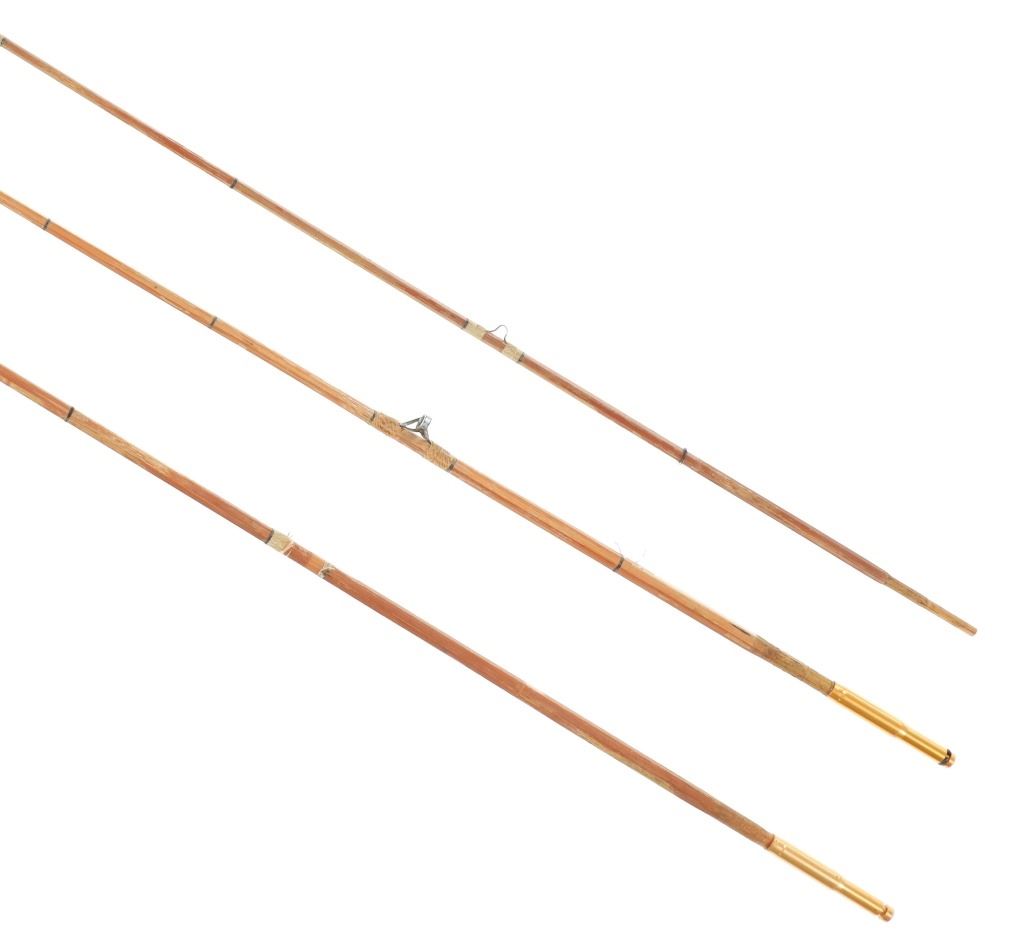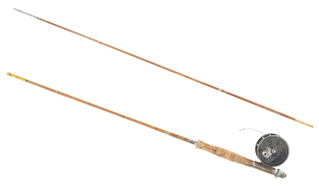 Featured in this lot is this Kiraku and Co. Grampus Tokyo, Japan circa 1950's. The fly rod is a segmented rod constructed from bamboo and shows a reel with a three piece segmented set up and a two piece segmented set up. The condition of this fly rod is preserved with some of the female tubes of the rod shaft loose on the rod and shows some wear to the wrapping and wear to the rod itself but otherwise shows preserved condition. The measurements of this fly rod is 8ft with the longer rod and 5 1/2ft for the shorter rod. The collective weight of this fly rod with all the shafts is 12oz.