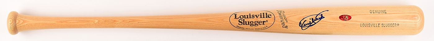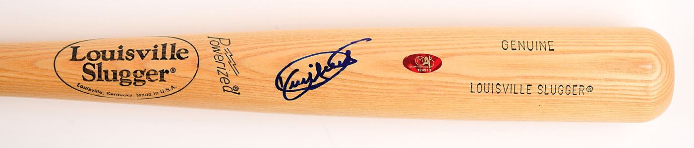Official Louisville Slugger baseball bat, signed in blue felt tip on the barrel by Kirby Puckett. In fine condition, with an MAB Celebrity Services label affixed to the barrel. Accompanied by a certificate of authenticity from MAB Celebrity Services.