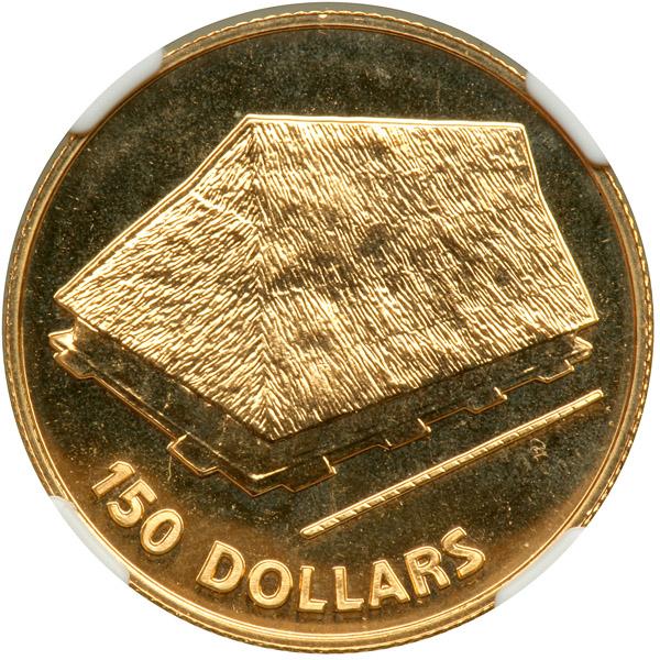 Kiribati. 150 Dollars, 1979. Fr-1; KM-9. Weight 0.4711 ounce. Mintage 422. For Independence. Traditional meeting hut. NGC graded MS-67.