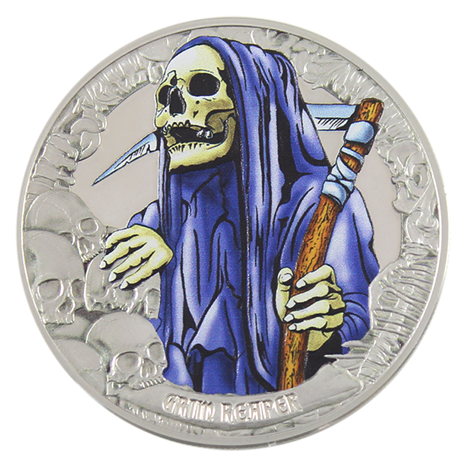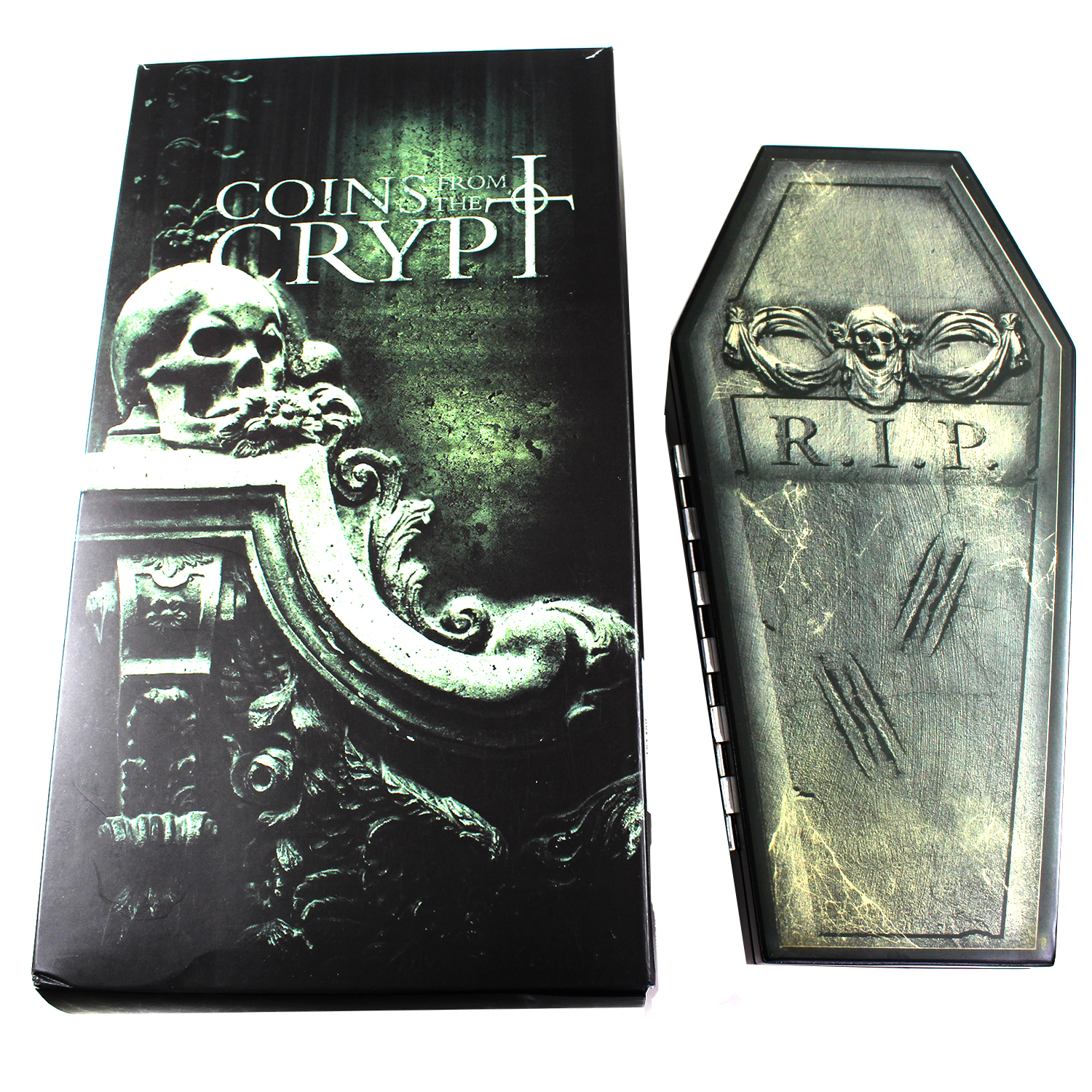 #623 of only 2000! This spooky set embraces the classic horrors of Halloween with four 25g .925 fine silver selectively coloured coins. The case has been crafted into the shape of a coffin. Coins are very lightly toned. Minor wear to outer box.