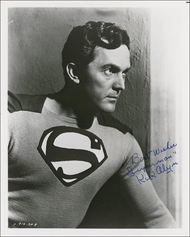 Glossy 8 x 10 photo of Alyn as Superman, signed in blue felt tip, “Best wishes, ‘Superman’ Kirk Alyn.” First letter of sentiment a few shades light, otherwise very fine condition. Pre-certified PSA/DNA and RRAuction COA.