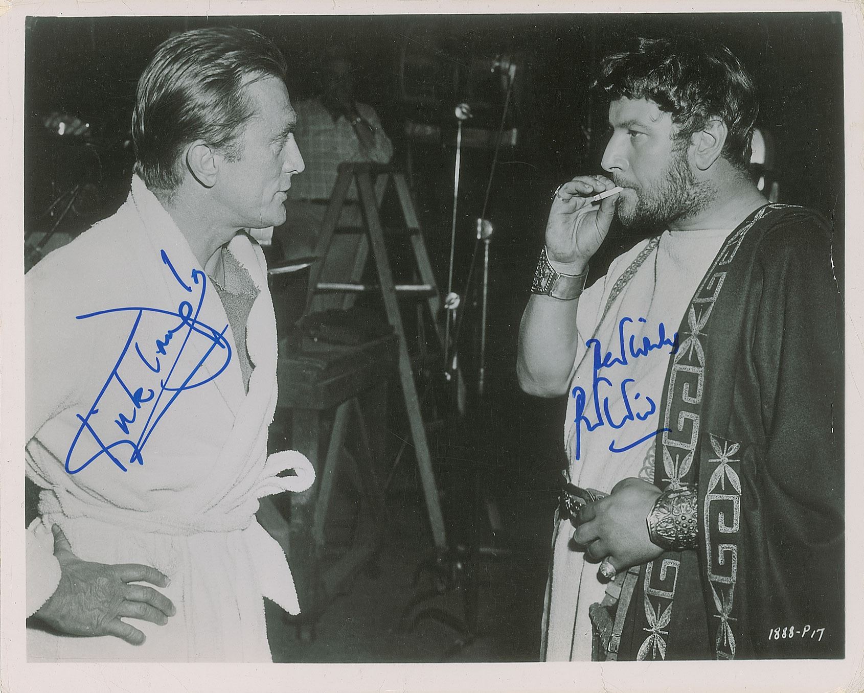 Glossy 10 x 8 photo of Douglas and Ustinov together on the set of Spartacus, signed in blue felt tip, "Kirk Douglas" and "Best wishes, Peter Ustinov." In very good to fine condition, with creasing to the sides and corners.