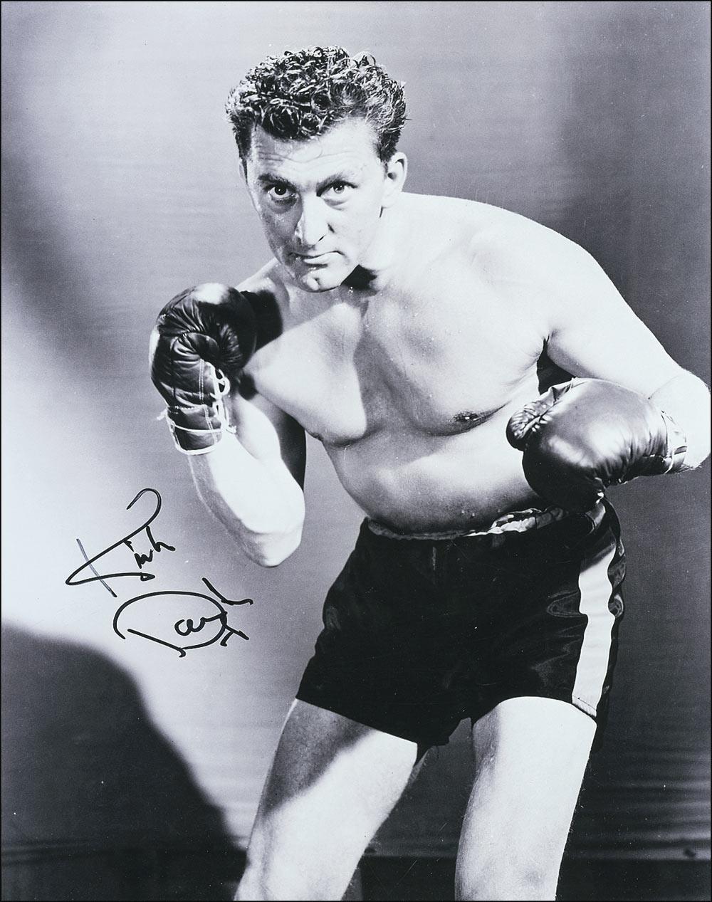 Satin-finish 11 x 14 photo of Douglas, barechested from the film Champion, signed in black felt tip. In fine condition.