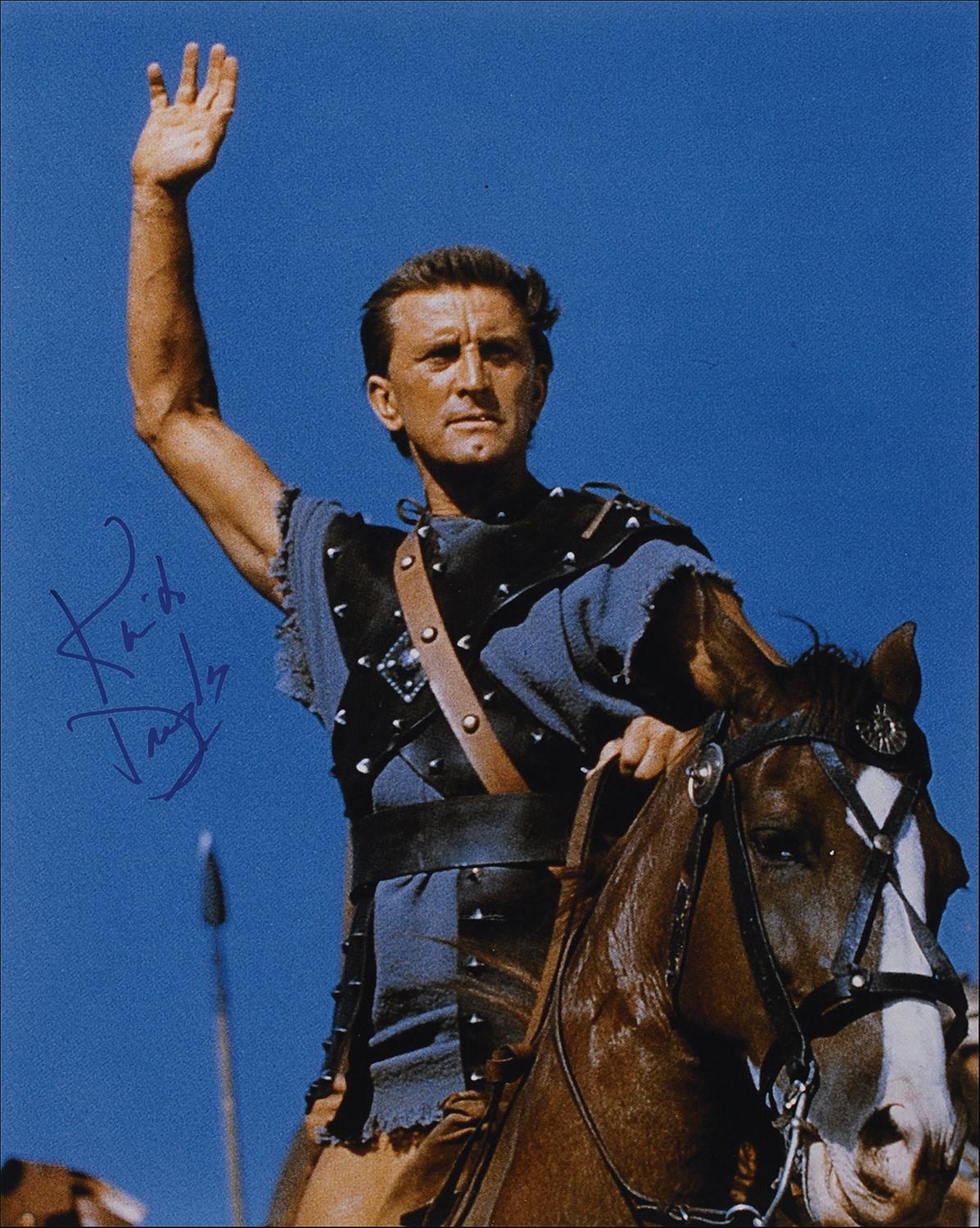 Color satin-finish 16 x 20 photo of Douglas on horseback in Spartacus, signed in blue felt tip. In fine condition, with a few scattered light bends and creases.