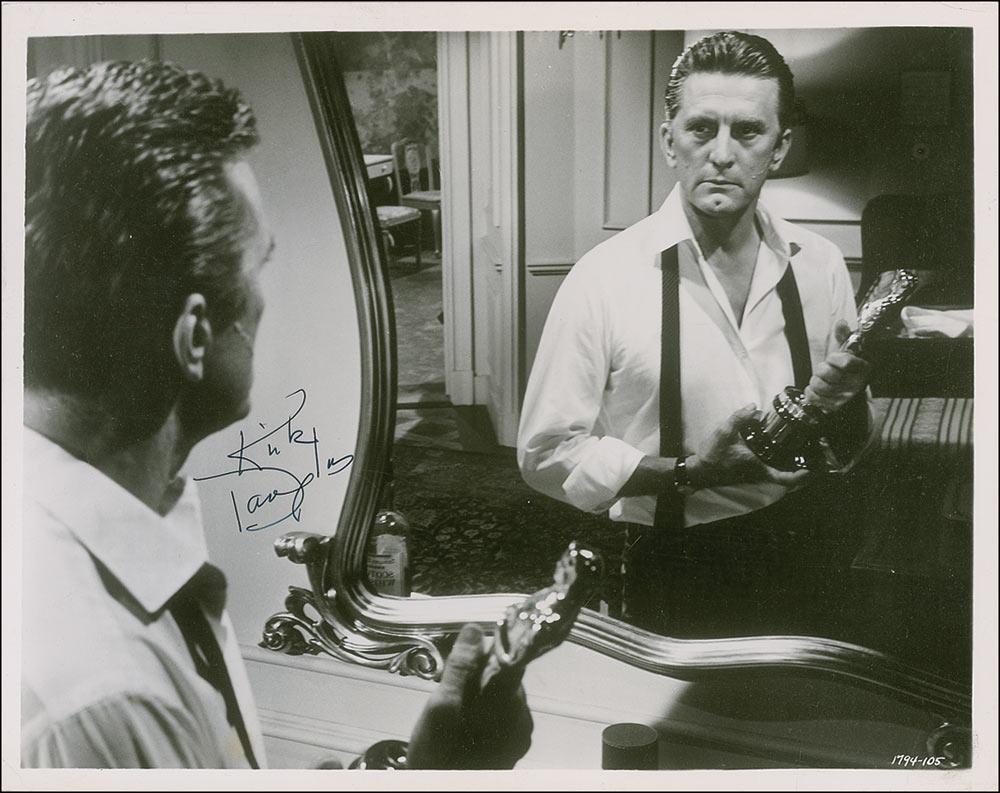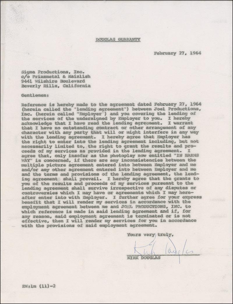 Two items: DS, one onionskin page, 8.5 x 11, February 27, 1964. Acknowledgment of an agreement between Douglas and Joel Productions “covering the lending of the services of the undersigned by Employer to you”; and a glossy 8 x 10 still from the film Two Weeks in Another Town showing Douglas’ character holding an Oscar, signed in black ink. In fine condition, with some light creasing and faint streaking to the photo.