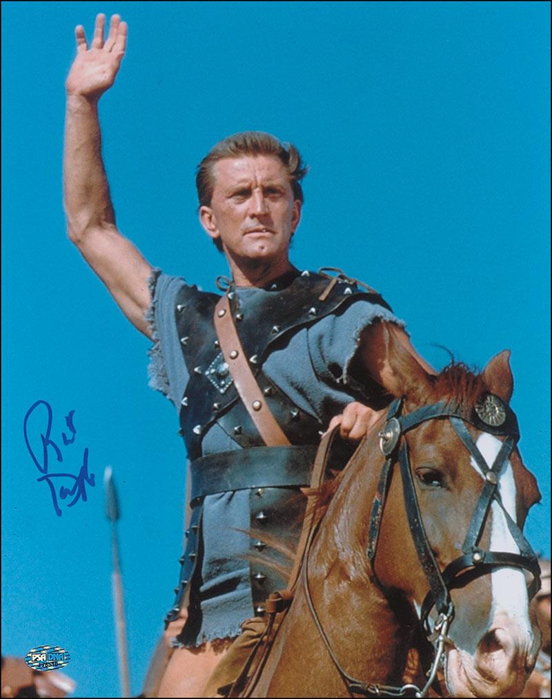 Color satin-finish 11 x 14 photo of Douglas on horseback as Spartacus, signed in blue felt tip. In fine condition, with a few scattered light surface creases and a PSA/DNA authentication label affixed to bottom corner. Accompanied by a certificate of authenticity from PSA/DNA.