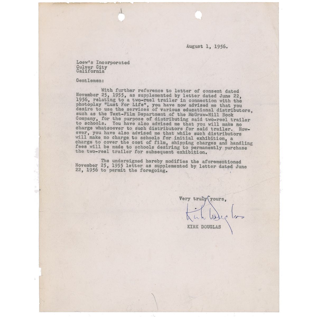 DS, one page, 8.5 x 11, August 1, 1956. Douglas grants Loew’s Incorporated permission regarding the educational disbursement of “the photoplay ‘Lust For Life’” through such distributors as Text-Film Department and the McGraw-Hill Book Company. In very good condition, with scattered light to moderate creasing, toning and two punch holes along the top edge, some small tears along the left edge, a few stray pencil marks, and one of the horizontal mailing folds passing through the signature.