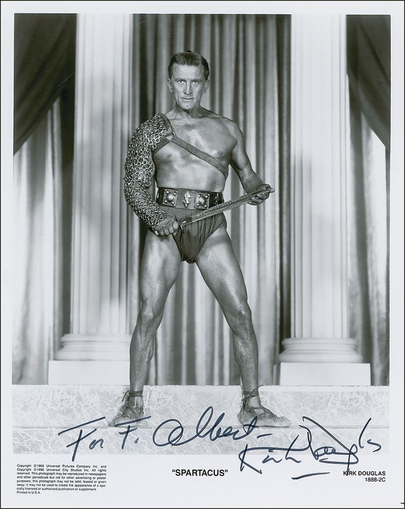 Intimidating glossy 8 x 10 Universal promotional photo for Spartacus, signed and inscribed in black felt tip “For F. Albert, Kirk Douglas.” In fine condition.