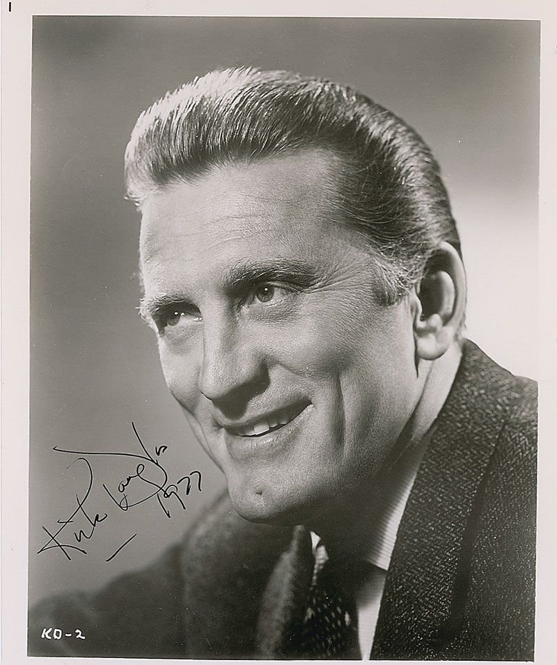 Glossy 8 x 9.5 head-and-shoulders photo, signed in black ink, “Kirk Douglas 1977.” Trimmed bottom edge and some scattered light surface marks, otherwise fine condition.