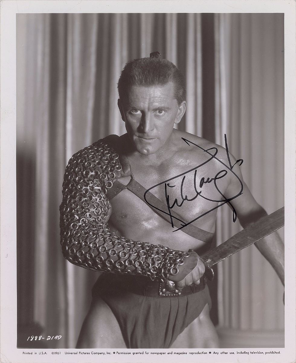 Powerful glossy 8 x 10 Universal Pictures publicity photo of Douglas as the titular hero from the 1960 film Spartacus, signed in black felt tip. In fine condition, with scattered light creasing.