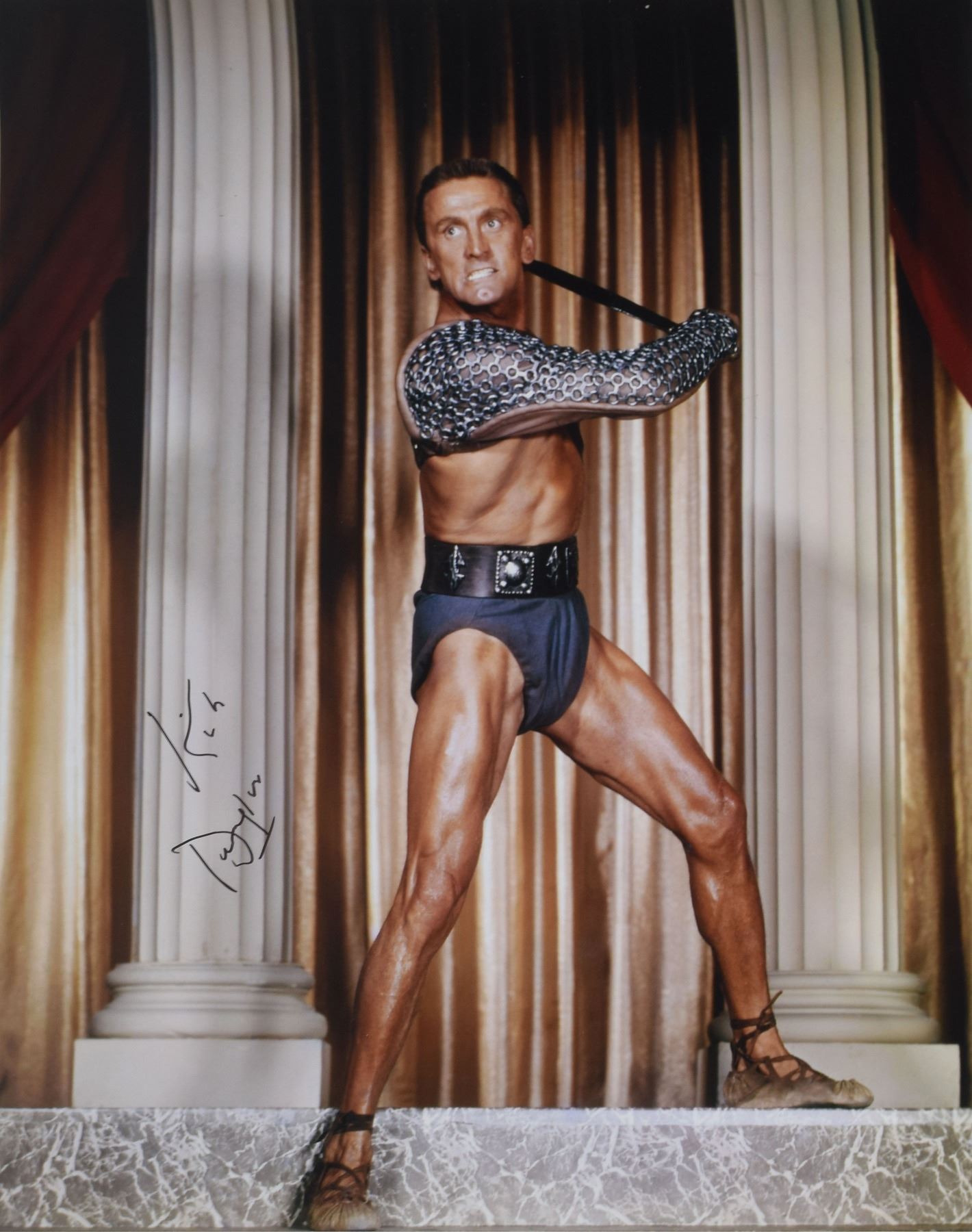 Color satin-finish 16 x 20 full-length photo of Douglas as the titular hero from the 1960 film Spartacus, signed in later age in black felt tip. In fine condition.