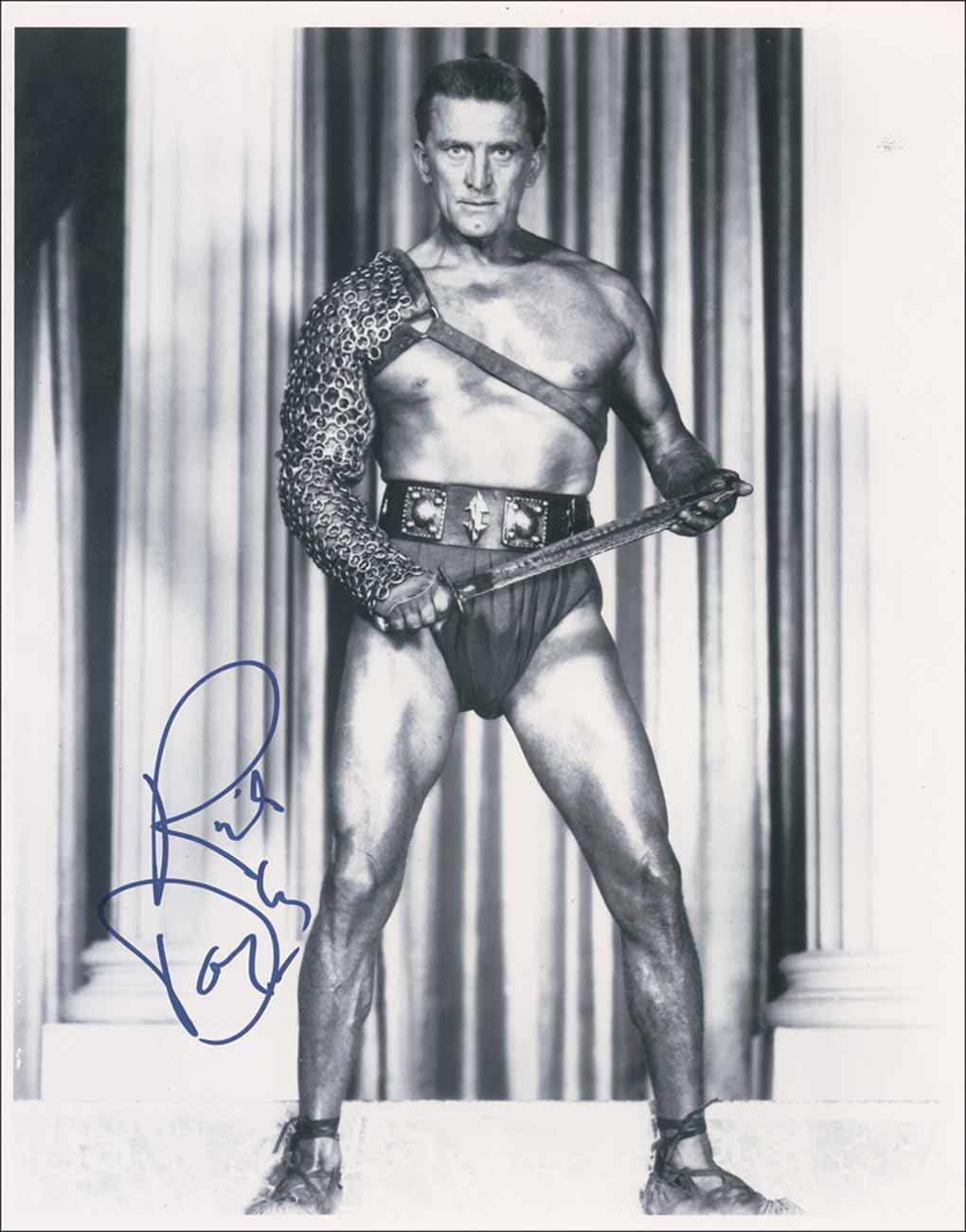 Glossy 11 x 14 full-length photo of Douglas as Spartacus, signed in-person in blue felt tip. In very fine condition.