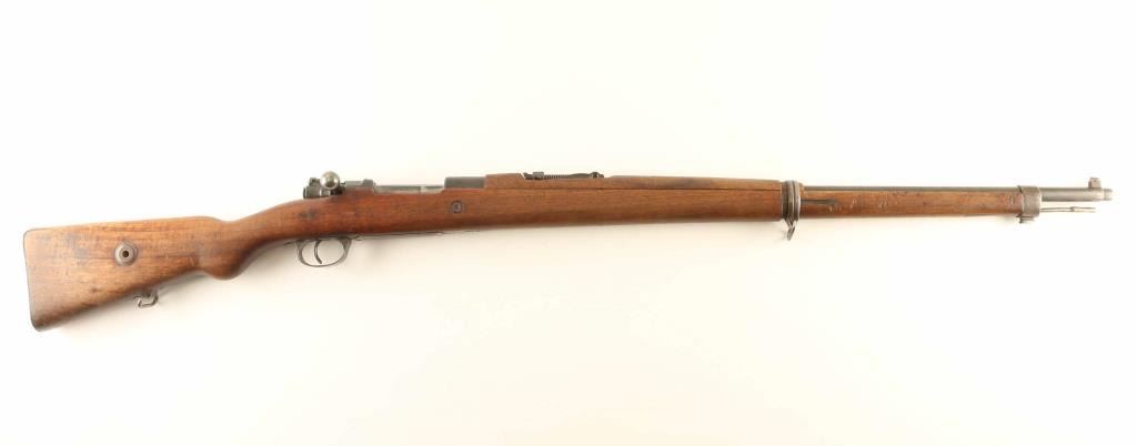 WWII era Turkish military bolt action service rifle chambered in 7.92x57mm Mauser, manufactured at the Kirkkale arsenal circa 1940. Features a blued finish, 29.5" barrel, dovetailed inverted 'v' front sight, tangent rear sight graduated to 2,000 meters, two barrel bands with bayonet lug on the front band, cleaning rod, smooth trigger, straight bolt handle, three-position safety, large ring receiver with thumb cut, internal box magazine with removable floorplate, sling swivels, smooth wood handguard and full-length semi-pistol grip shoulder stock with bolt disassembly disk & smooth metal buttplate. Matching serial numbers are found on the receiver, bolt handle, bottom metal, floorplate and rear sight assembly. Rifle exhibits little remaining finish with the majority of the metal surfaces turned to an aged brown patina. Action is smooth, the bore is very good and the wood stocks are near good with numerous blemishes & a 3” crack in the handguard. Condition is near NRA Good. ***C&R Firearm***