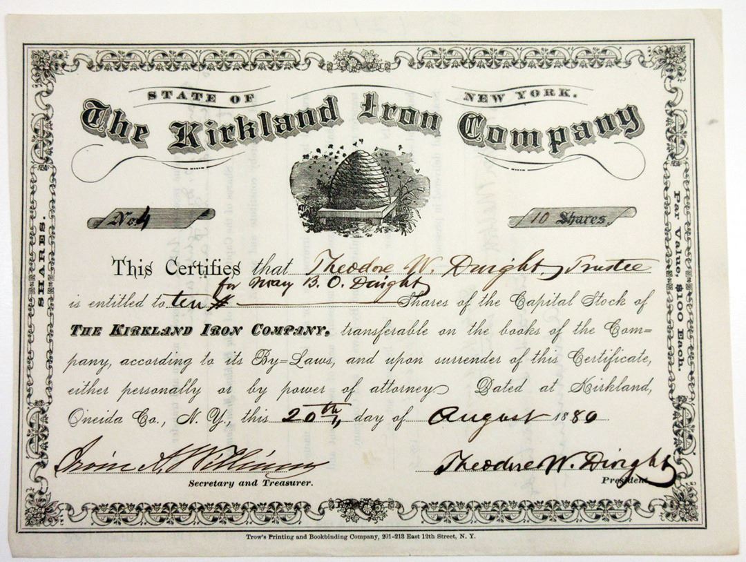 Oneida County, NY. Kirkland Iron Co., 1880 10 Shrs I/U Stock Certificate XF, Trow's Printing, Kirkland Iron Company was a New York company.