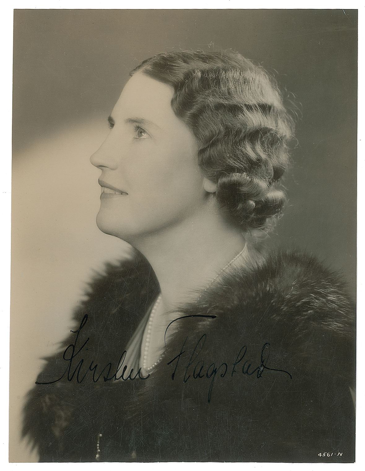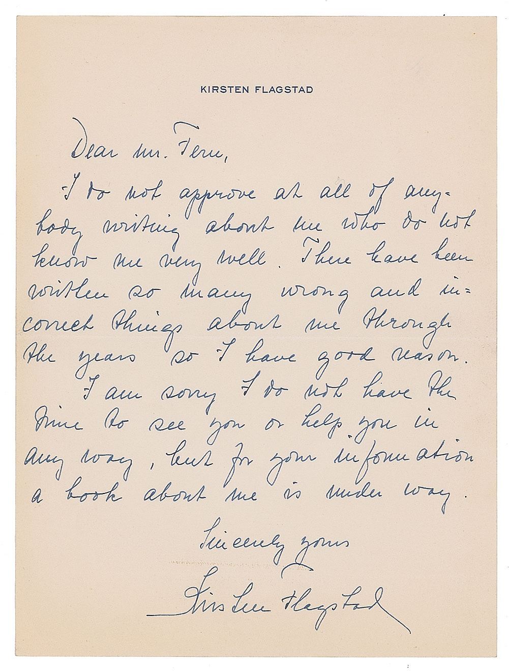 Two items: a vintage glossy 6.75 x 9 profile portrait of the great Norwegian opera singer, signed in fountain pen by Kirsten Flagstad; and an ALS, one page, 5.75 x 7.75, personal letterhead, no date, in full: "I do not approve at all of anybody writing about me who do not know me very well. There have been written so many wrong and incorrect things about me through the years so I have good reason. I am sorry I do not have the time to see you or help you in any way, but for your information a book about me is under way." In overall very good to fine condition, with scattered light creasing to the photo.