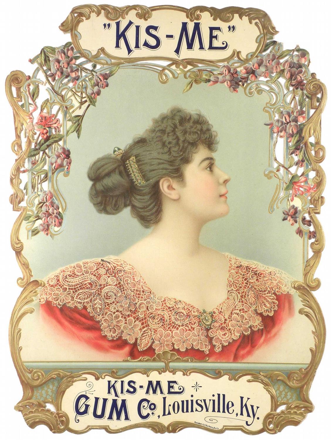 Kis-Me Embossed Die Cut Cardboard Sign. Kis-Me Gum Co. Louisville, KY. Dress and hair band have glitter embellishment. Some paper loss in upper right otherwise excellent condition. 15 X 20 inches.