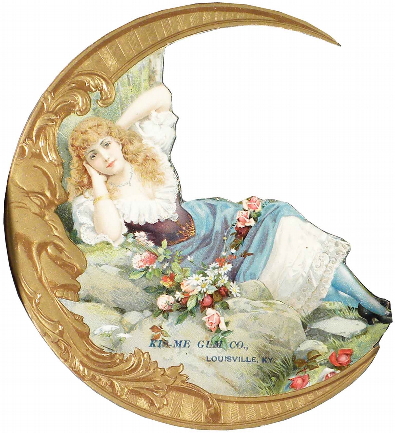 Kis-Me Gum Co. Embossed Die Cut Sign. Louisville, KY. Image of reclining woman/man in the moon. Framed under glass. Near mint condition. 7 X 7 1/2 inches image only. 7 3/4 X 12 inches image only.