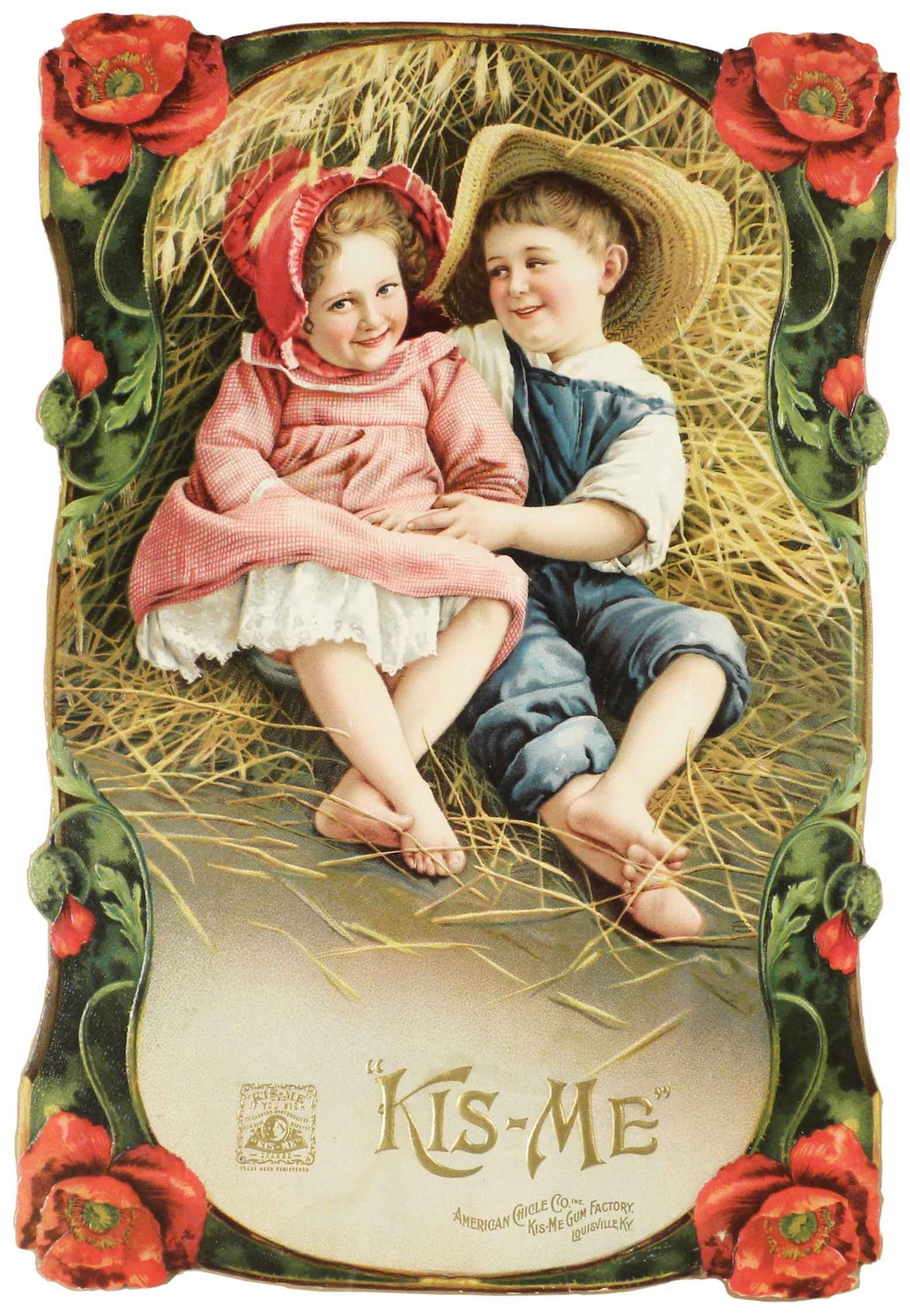Kis-Me Gum Embossed Die Cut Cardboard Sign. Depicting young sweet hearts nestled in the hay. Framed under glass. Near mint condition. 11 3/4 X 17 1/4 inches.