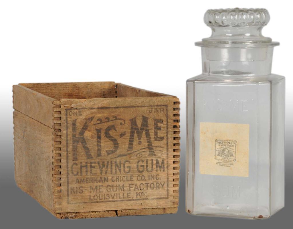 Description Original chewing gum wrapper is on the jar itself, but is not original to the jar. Lid has some roughness, but not noticeable. Also includes a wooden crate that the jar would have come in. Crate has "Kis-Me" stenciled on both ends. Condition (Very Good). Size Jar: 4 - 1/2" x 11".