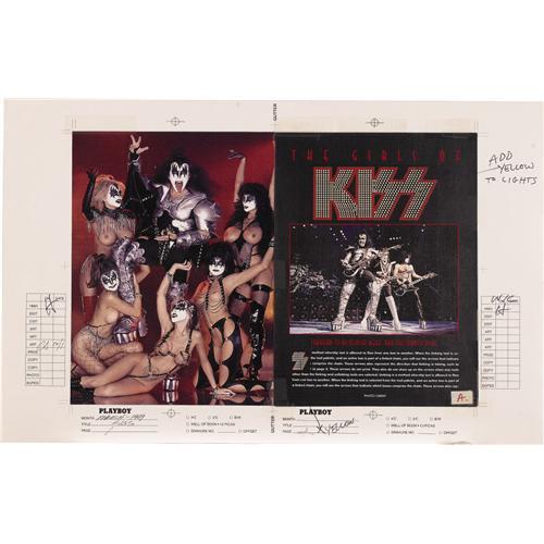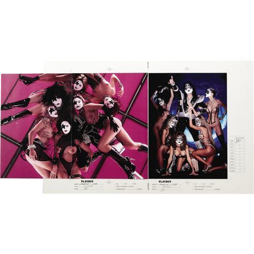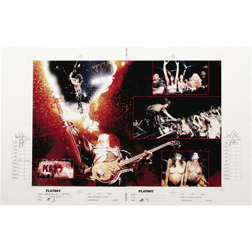 <B>Kiss Playboy Magazine Feature Proof Pages.</B></I> Full-color proof sheets for an eight-page "Girls of Kiss" feature that ran in the March 1999 issue of <I>Playboy,</B></I> featuring Gene Simmons surrounded by a bevy of barely clad beauties in Kiss make-up. One of the proofs features a mock-up for a three-panel fold-out. There are editing notes written along the sides and the proof sheets have been initialed by Hugh Hefner, signifying his approval. In Excellent condition.<BR><BR><b>Shipping:</b> Flat Material, Large (<a target="_blank" href="http://www.heritageauctions.com/common/shipping.php">view shipping information</a>)