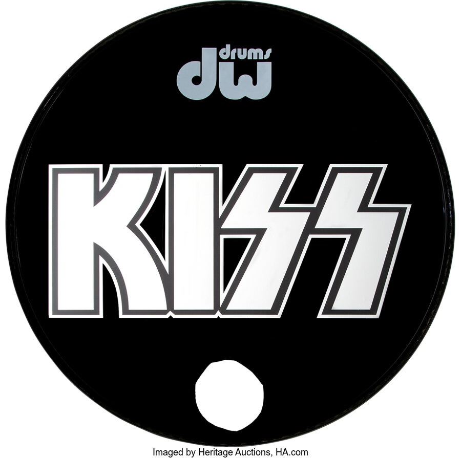 Kiss Stage-Used Kick Drum Head (1999). A 22" front kick drum head used by Peter Criss during Kiss's reunion tour on January 2, 1999 in Nashville, TN. This is not signed by any member of the band. Made by DW, the classic Kiss logo is front and center. Air hole appears to be hand cut. In Near Mint Minus condition with light handling wear. COA from Heritage Auctions.