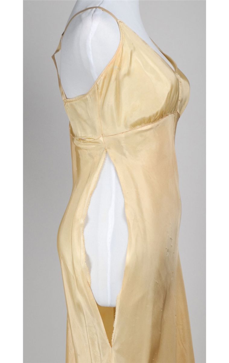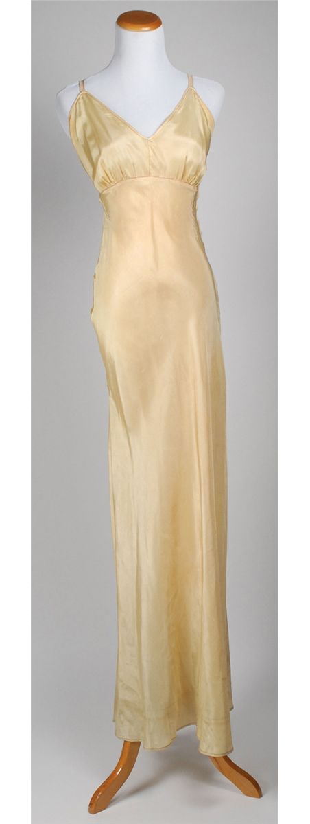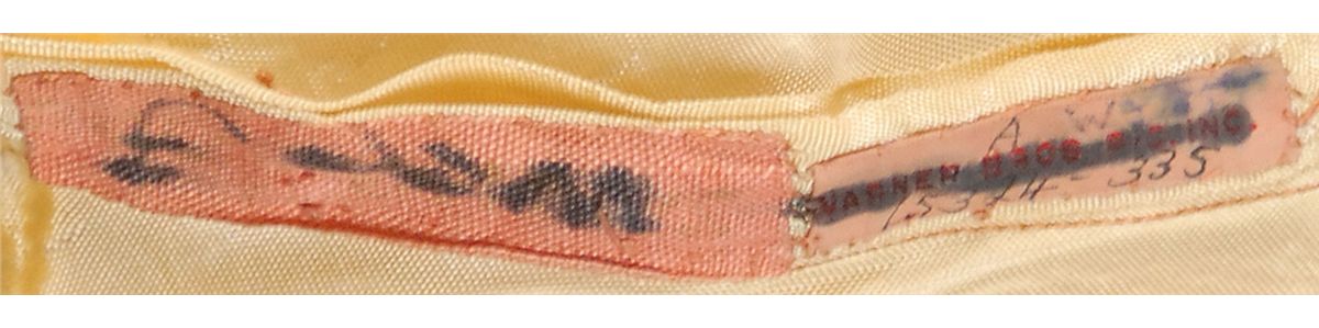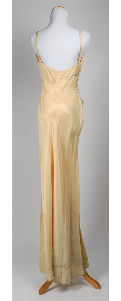 Cream-colored negligee worn by Wyatt in the 1941 film Kisses for Breakfast. Full-length negligee has snaps on the back and two thin shoulder straps. In fine condition, with a few small holes and thin areas to material.