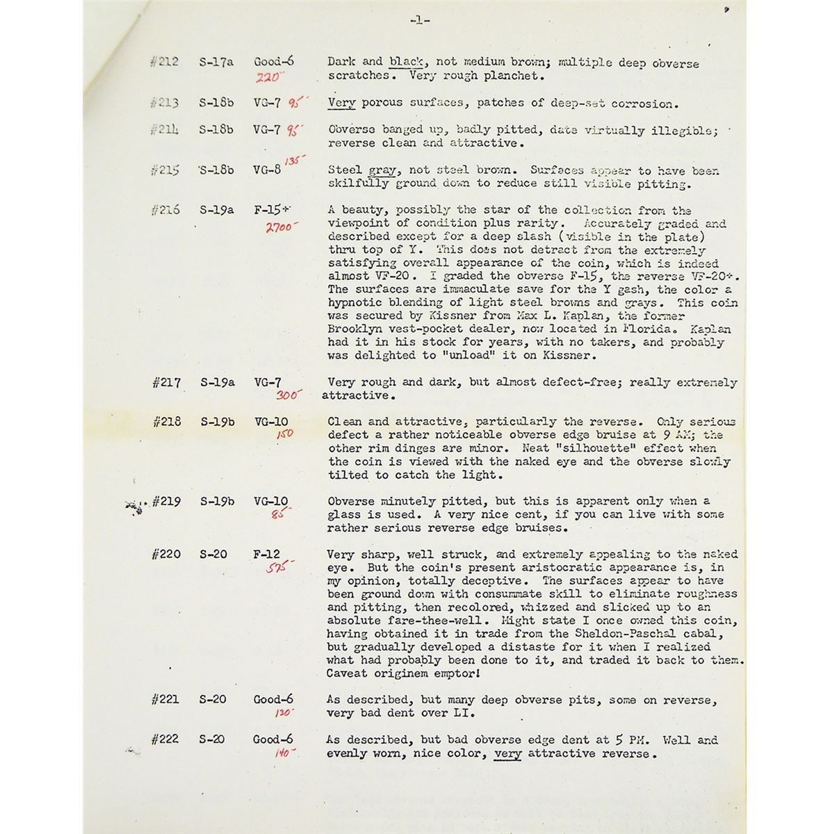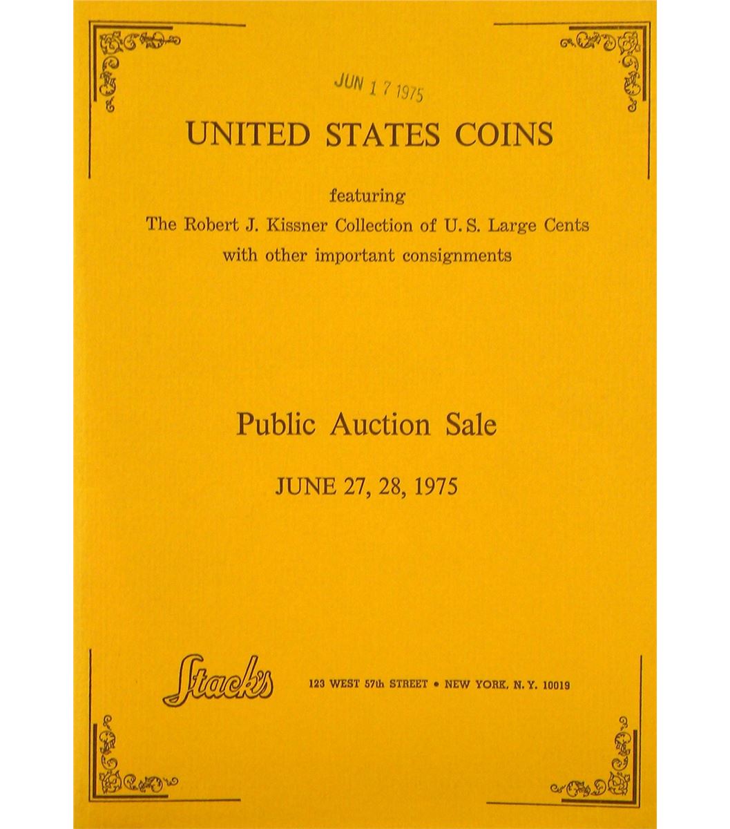 Stack's. UNITED STATES COINS FEATURING THE ROBERT J. KISSNER COLLECTION OF U.S. LARGE CENTS WITH OTHER IMPORTANT CONSIGNMENTS. New York, June 27-28, 1975. 8vo, original printed card covers. 93, (3) pages; 1060 lots; prices realized list. Large cent section underlined and priced in red ink; numerical notes on condition. With cover page and 11 numbered duplicated typescript sheets, priced in red ink, comprising C. Douglas Smith's descriptions regarding the condition, grading and other aspects of Kissner's cents (lots 212-414). Fine. Robbie Brown's copy. In the cover note, Smith observes: "you should get a pretty good slant on the collection from what I have written, and certainly a more accurate one than that presented by Stack's!"