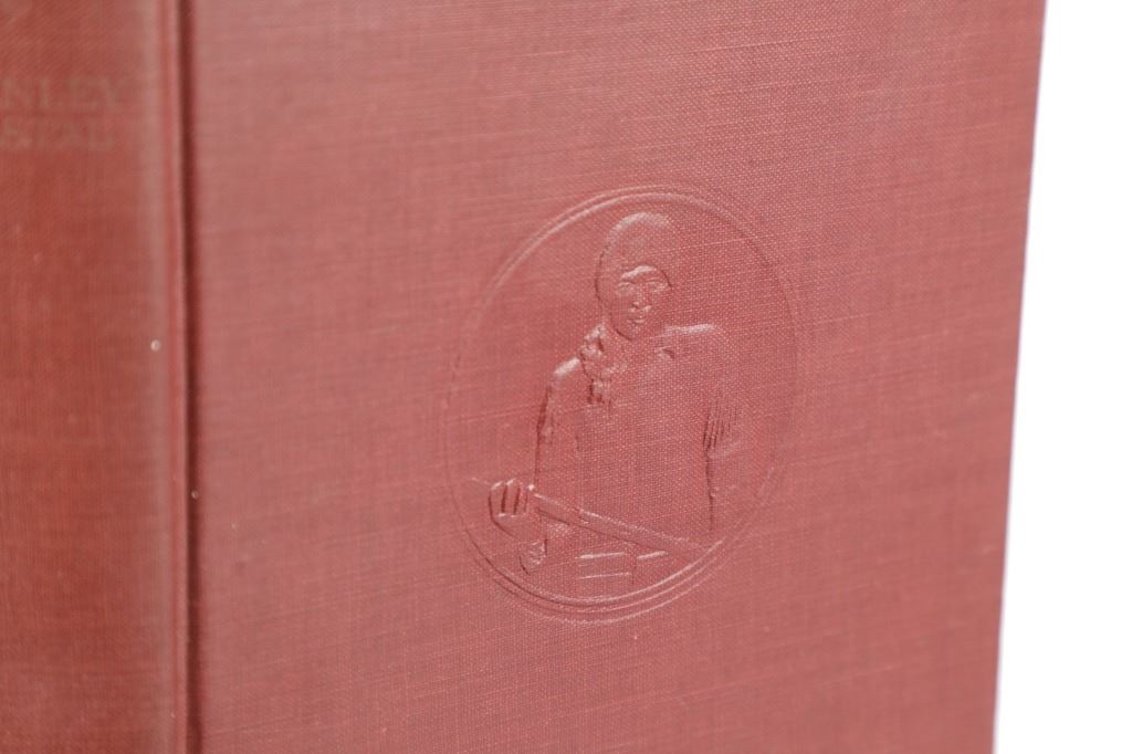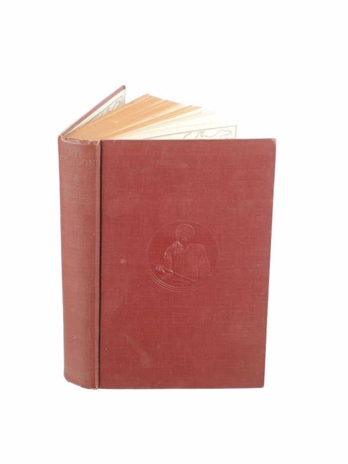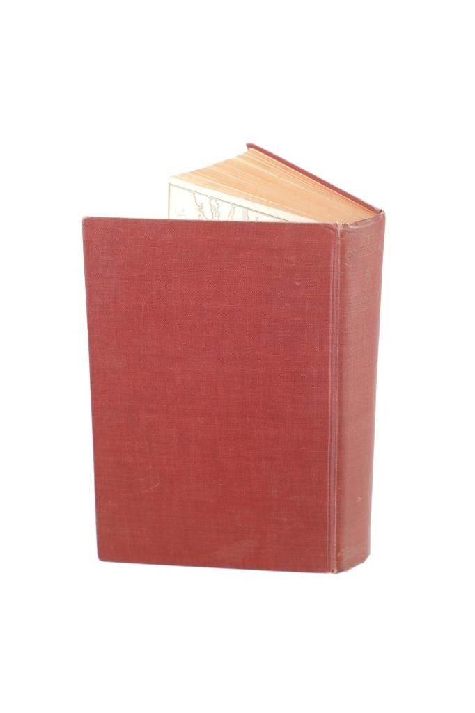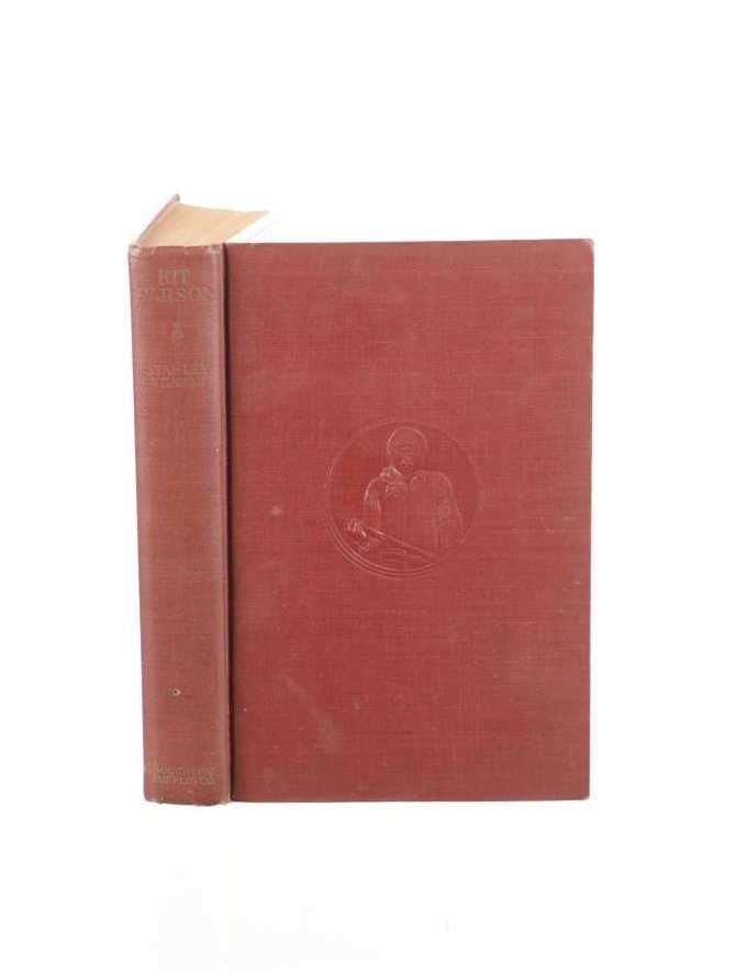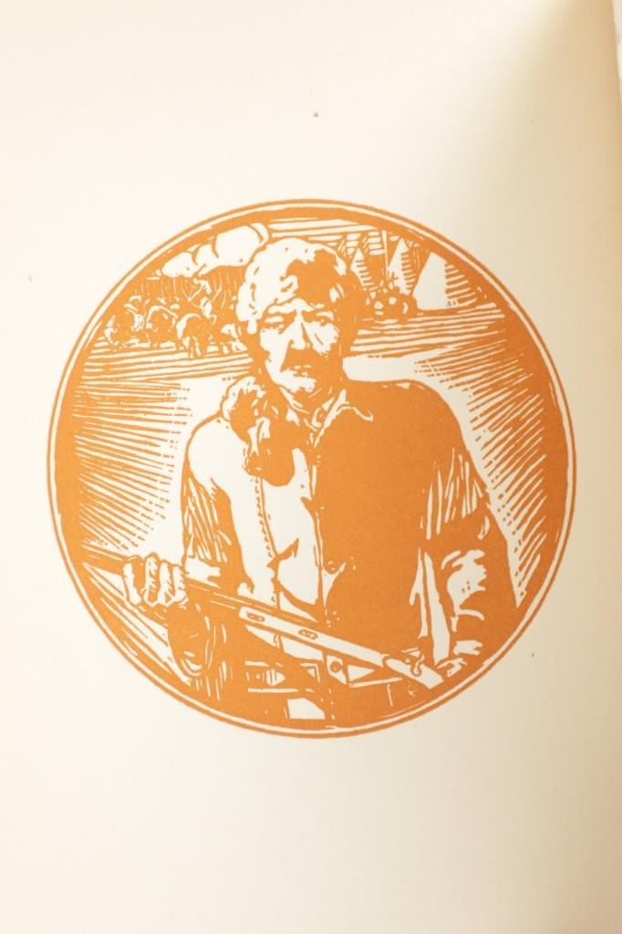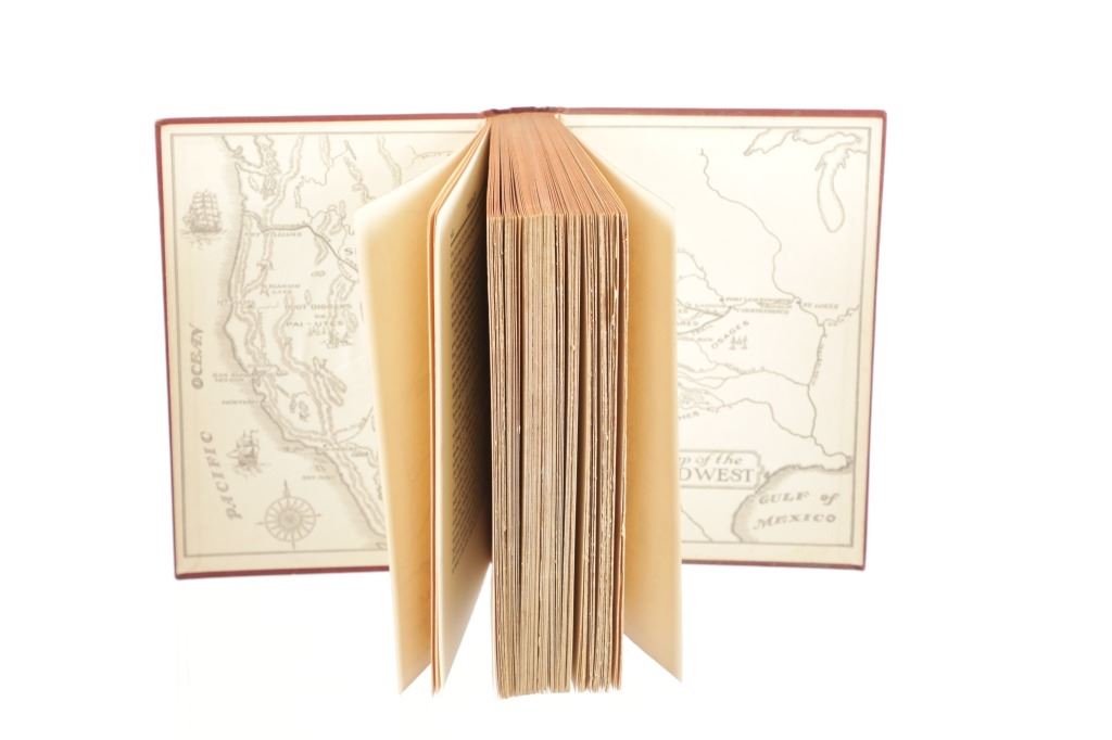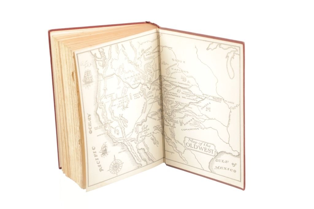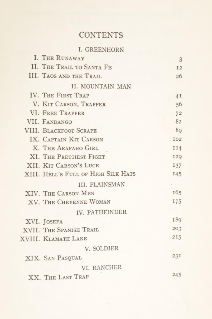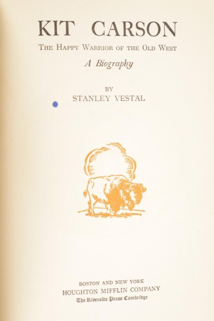 For your consideration is a First Edition of “Kit Carson the Happy Warrior of the Old West” by Stanley Vestal, Houghton Mifflin Company Boston and New York, publishers, 1928. A classic biography of this important character in the American West. Carson was a frontiersman, fur trapper, Indian fighter, scout, and Indian agent who made an important contribution to the westward expansion of the United States. Although he was famous for much of his life, historians in later years have written that Kit Carson did not like, want, or even fully understand the fame that he experienced during his life. During the late nineteenth century, Kit Carson became a legendary symbol of America's frontier experience, which influenced twentieth century erection of statues and monuments, public events and celebrations, imagery by Hollywood, and the naming of geographical places. Endpapers are "Map of the OLD WEST". The red cloth bound gold gilt stamped illustrated hardcover is in nice condition, gilt has faded, scuffing noted. Intact pages feature painted top edge, deckled bottom and fore edges. Age tanning observed. Measures 6"W x 9"L x 1.25"D, weight 1lb 2oz.*