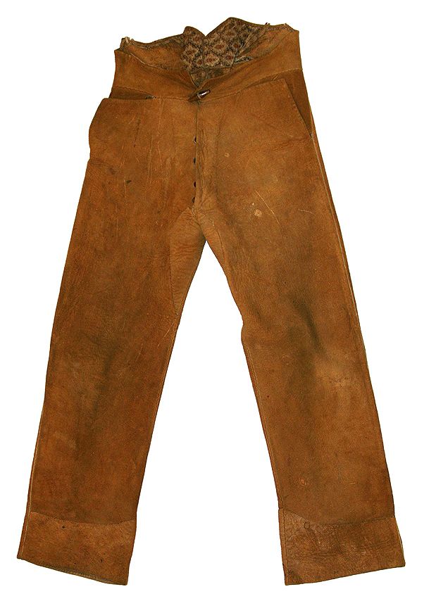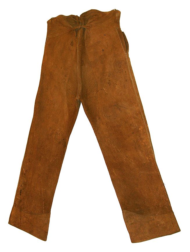Elk Hide Pants Belonging To Kit Carson. 43" long, all hand sewn elk hide with two front interior pockets, button fly with a wooden toggle - bottom button is Civil War vintage. Circa 1860. (est. $5,000-10,000). Provenance: "Kit" Carson (1809-1868), by descent to his son "Kit" Carson II (1858-1929), by sale to Ralph Meyers (1885-1948), by descent to his wife Rowena Meyers Martinez (1909-2000), by descent to her son Ouray Meyers (b. 1941). CONDITION REPORTS: www.auctioninsantafe.com/docs/cr2012.pdf