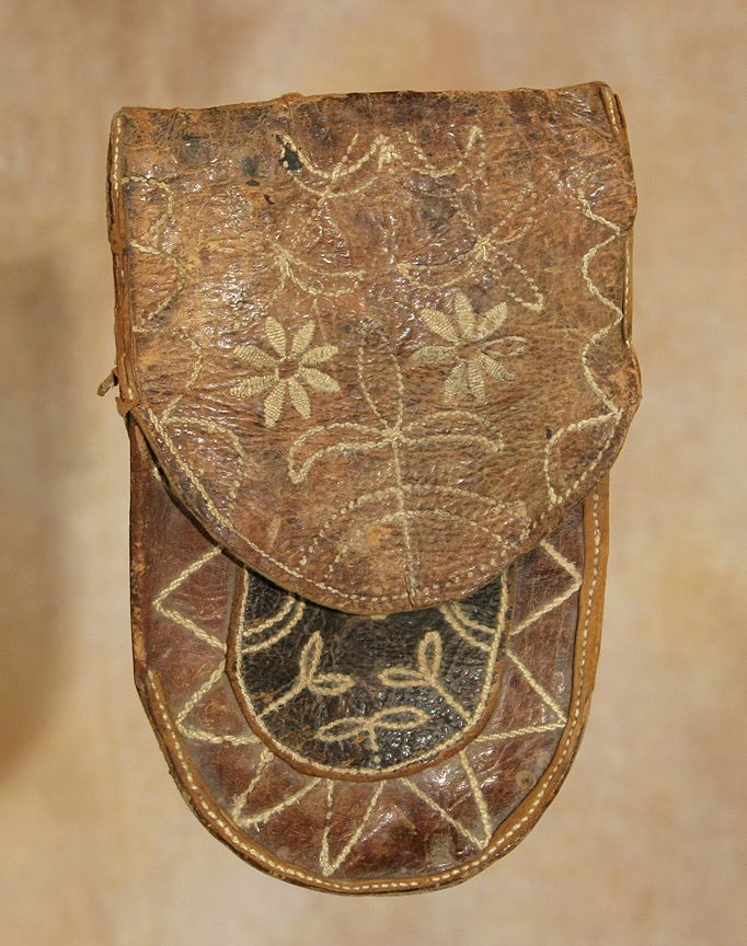 Kit Carson's Leather Message Pouch. Two piece embroidered commercial leather pouch. The 6 ½" x 6 ½" cover sits over a 7 ¾" x 6" lower portion. Used by Kit Carson to deliver documents to Presidents & Generals. Circa 1850s. (est. $5,000-10,000). Perhaps the most important Carson artifact in this collection. Provenance: "Kit" Carson (1809-1868), by descent to his son "Kit" Carson II (1858-1929), by sale to Ralph Meyers (1885-1948), by descent to his wife Rowena Meyers Martinez (1909-2000), by descent to her son Ouray Meyers (b. 1941). CONDITION REPORTS: www.auctioninsantafe.com/docs/cr2012.pdf