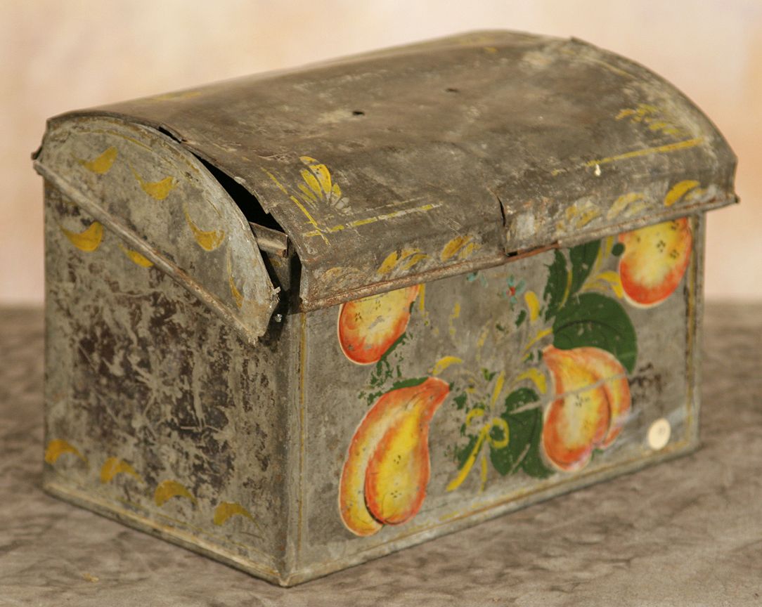 Painted Tin Box From Kit Carson's House. 7" x 9 ½" x 5 ¾" with painted fruit. Circa 1850. (est. $300-500). Provenance: "Kit" Carson (1809-1868), by descent to his son "Kit" Carson II (1858-1929), by sale to Ralph Meyers (1885-1948), by descent to his wife Rowena Meyers Martinez (1909-2000), by descent to her son Ouray Meyers (b. 1941). CONDITION REPORTS: www.auctioninsantafe.com/docs/cr2012.pdf