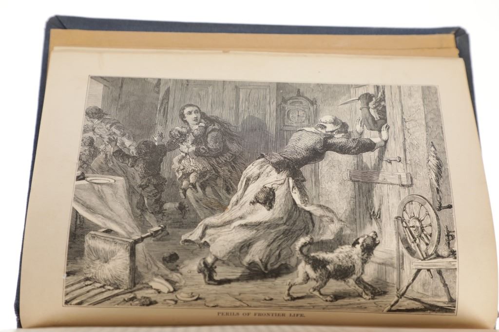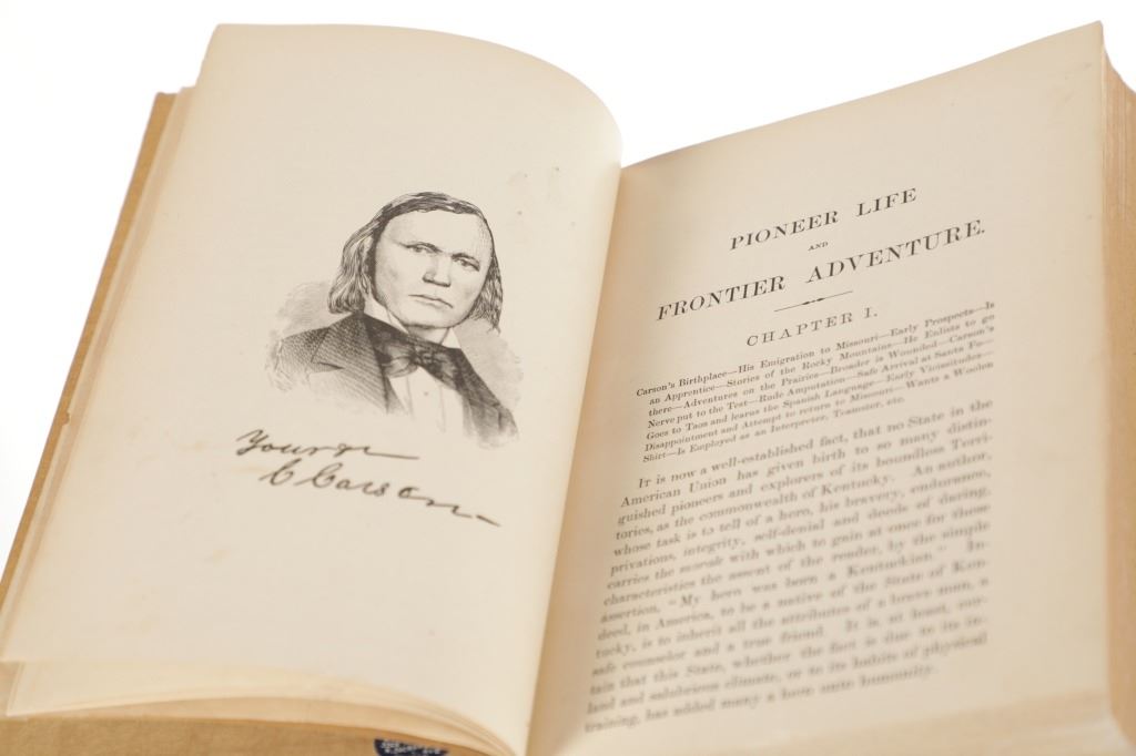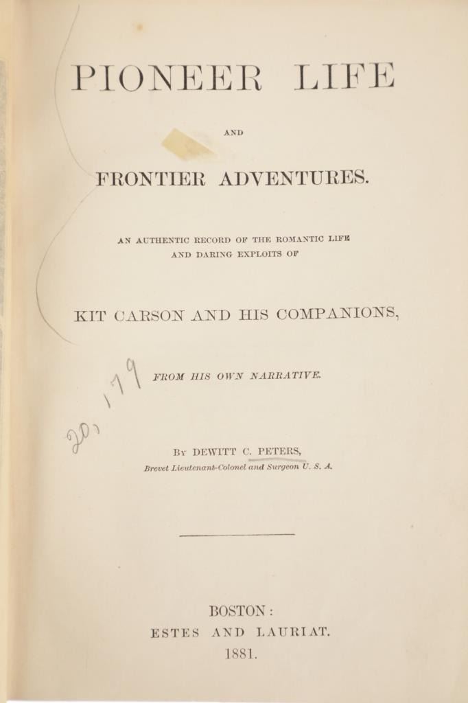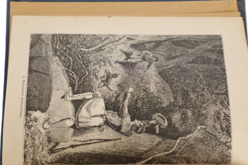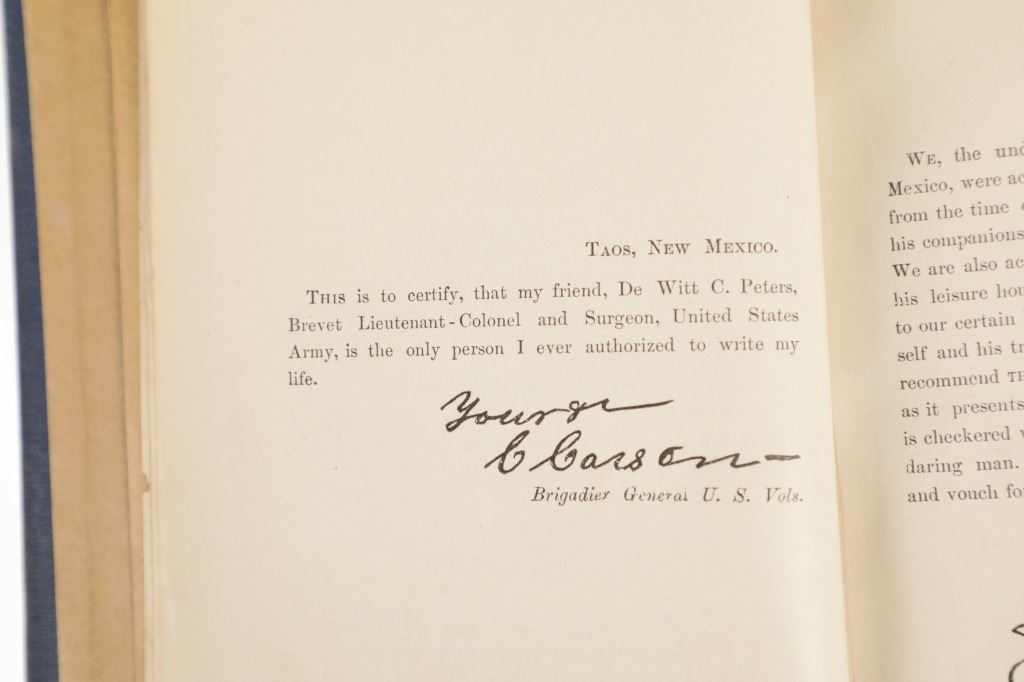 This is an 1881 edition of "Pioneer Life and Frontier Adventures" by Dewitt C. Peters, with over sixty (60) illustrations. The book chronicles the life and adventures of Kit Carson and his contemporaries. "Pioneer Life and Frontier Adventures, an authentic record of the romantic life and daring exploits of Kit Carson And His Companions From His Own Narrative By Dewitt C. Peters Brevet Lieutenant-Colonel and Surgeon U. S. A. Publisher Estes And Lauriat Boston 1881." Christopher Houston Carson was an American frontiersman; a fur trapper, wilderness guide, Indian agent, and U.S. Army officer. He became a frontier legend in his own lifetime by biographies and news articles, and exaggerated versions of his exploits were the subject of dime novels. His understated nature belied confirmed reports of his fearlessness, combat skills, tenacity, and profound effect on the westward expansion of the United States. Although he was famous for much of his life, historians in later years have written that Kit Carson did not like, want, or even fully understand the fame that he experienced during his life. DeWitt Clinton Peters (1829-1876) was a surgeon in the US Army during the 19th Century. He saw service in both the American Civil War and the Indian Wars. This blue clothbound gold gilt hardcover is in very nice overall condition, slight scuffing noted to cover edges, blue cloth exhibits some fading, gold gilt lettering is bright. Intact pages are in amazingly good condition, age tanning and slight foxing exhibited, no other obvious marring noted. Measures 6"W x 8.25"L x 1.5"D