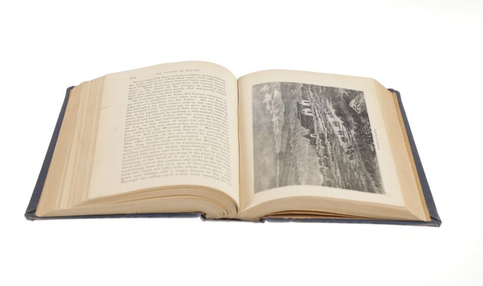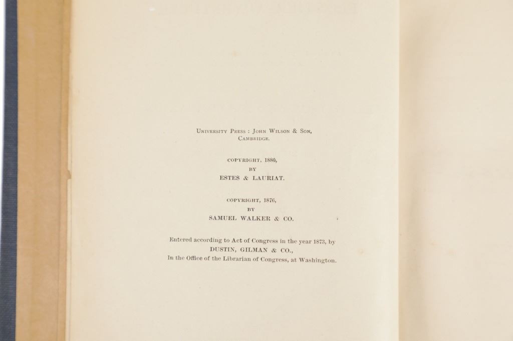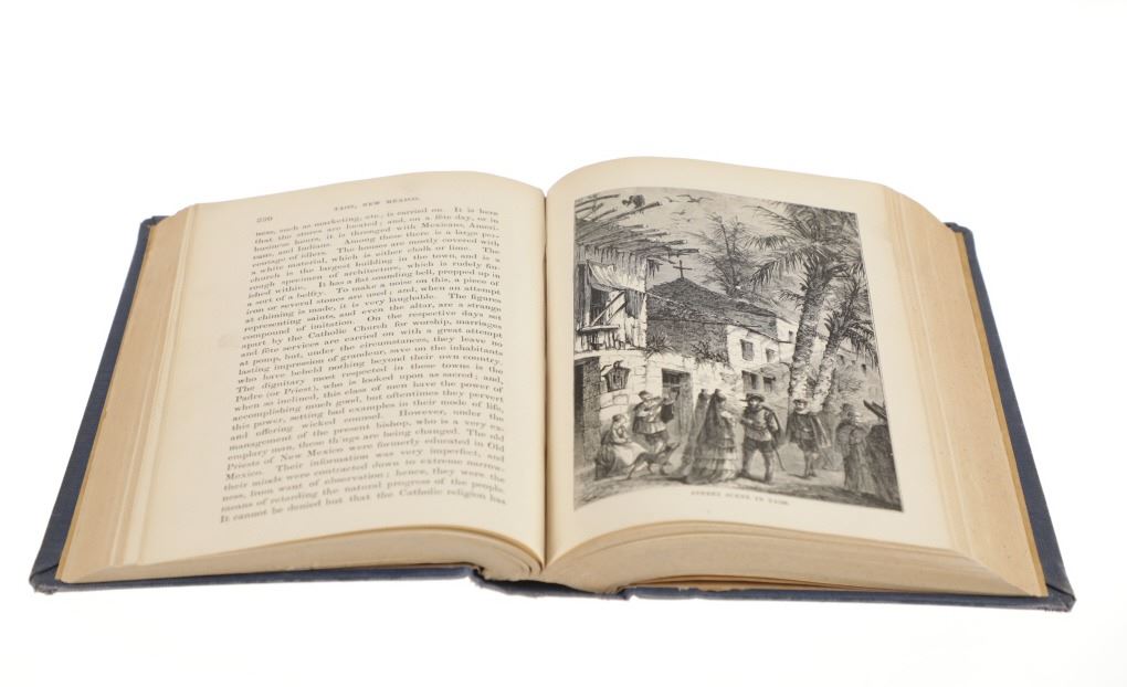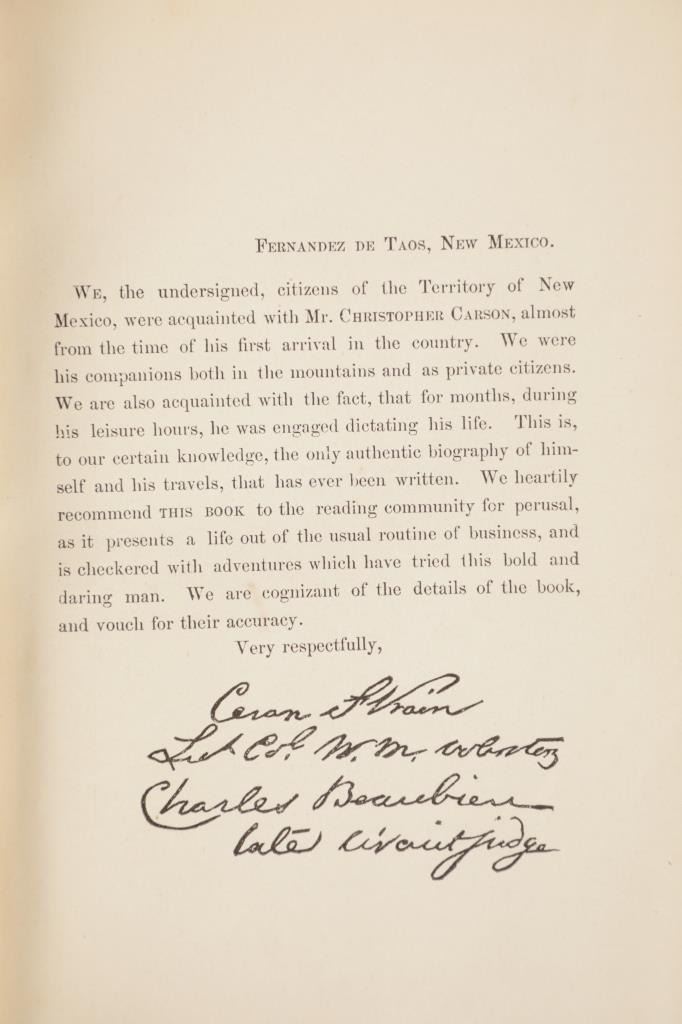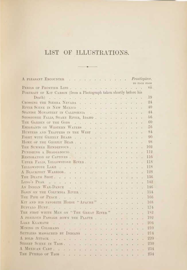 This is an 1881 edition of "Pioneer Life and Frontier Adventures" by Dewitt C. Peters, with over sixty (60) illustrations. The book chronicles the life and adventures of Kit Carson and his contemporaries. "Pioneer Life and Frontier Adventures, an authentic record of the romantic life and daring exploits of Kit Carson And His Companions From His Own Narrative By Dewitt C. Peters Brevet Lieutenant-Colonel and Surgeon U. S. A. Publisher Estes And Lauriat Boston 1881." Christopher Houston Carson was an American frontiersman; a fur trapper, wilderness guide, Indian agent, and U.S. Army officer. He became a frontier legend in his own lifetime by biographies and news articles, and exaggerated versions of his exploits were the subject of dime novels. His understated nature belied confirmed reports of his fearlessness, combat skills, tenacity, and profound effect on the westward expansion of the United States. Although he was famous for much of his life, historians in later years have written that Kit Carson did not like, want, or even fully understand the fame that he experienced during his life. DeWitt Clinton Peters (1829-1876) was a surgeon in the US Army during the 19th Century. He saw service in both the American Civil War and the Indian Wars. This blue clothbound gold gilt hardcover is in very nice overall condition, slight scuffing noted to cover edges, blue cloth exhibits some fading, gold gilt lettering is bright. Intact pages are in amazingly good condition, age tanning and slight foxing exhibited, no other obvious marring noted. Measures 6"W x 8.25"L x 1.5"D