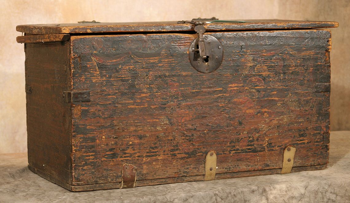 Kit Carson's Wooden Trunk. 15" x 30" x 14". Leather hinges. 19th century. Shows lots of use. (est. $1,000-2,000). Provenance: "Kit" Carson (1809-1868), by descent to his son "Kit" Carson II (1858-1929), by sale to Ralph Meyers (1885-1948), by descent to his wife Rowena Meyers Martinez (1909-2000), by descent to her son Ouray Meyers (b. 1941). CONDITION REPORTS: www.auctioninsantafe.com/docs/cr2012.pdf