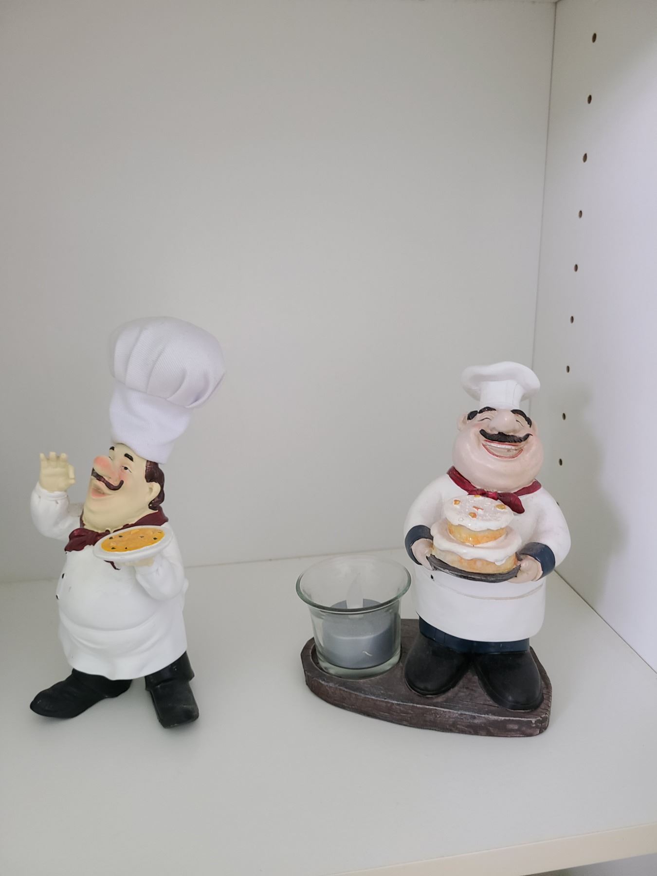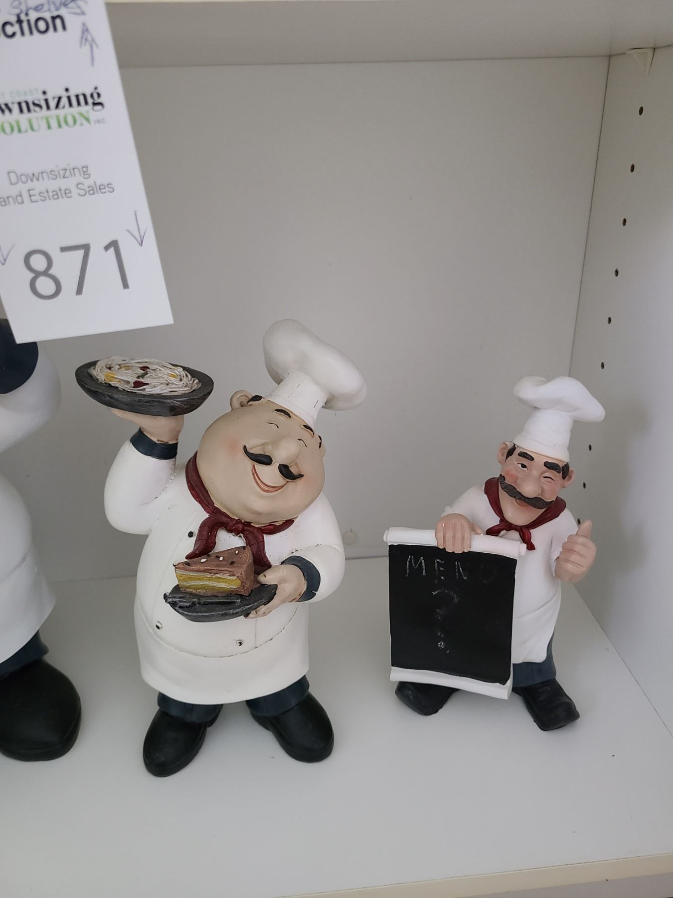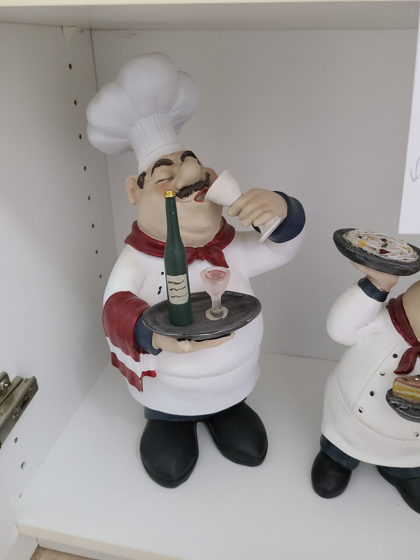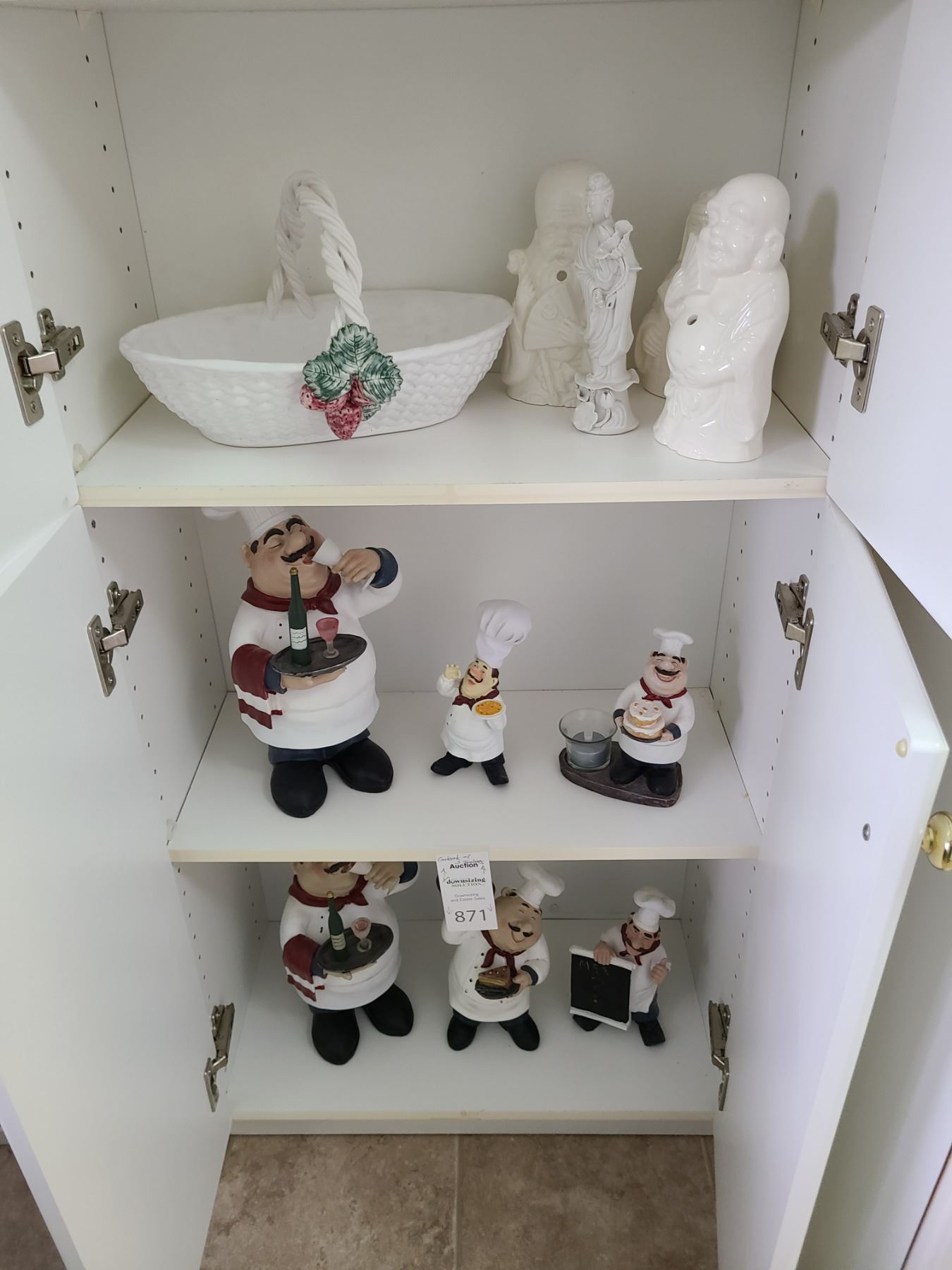 Three shelves of kitchen decor including chefs, large ceramic bowl from Portugal, and three Suehiro characters. Bring packing material. Pickup 9 am.