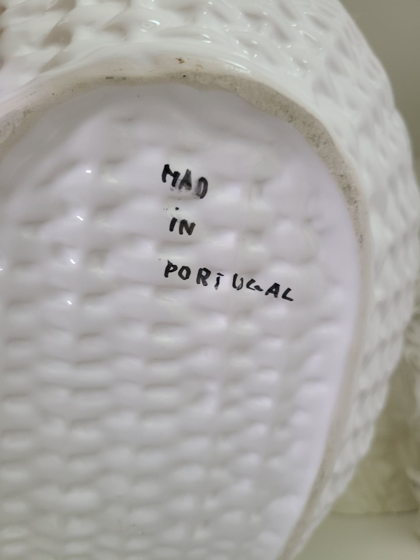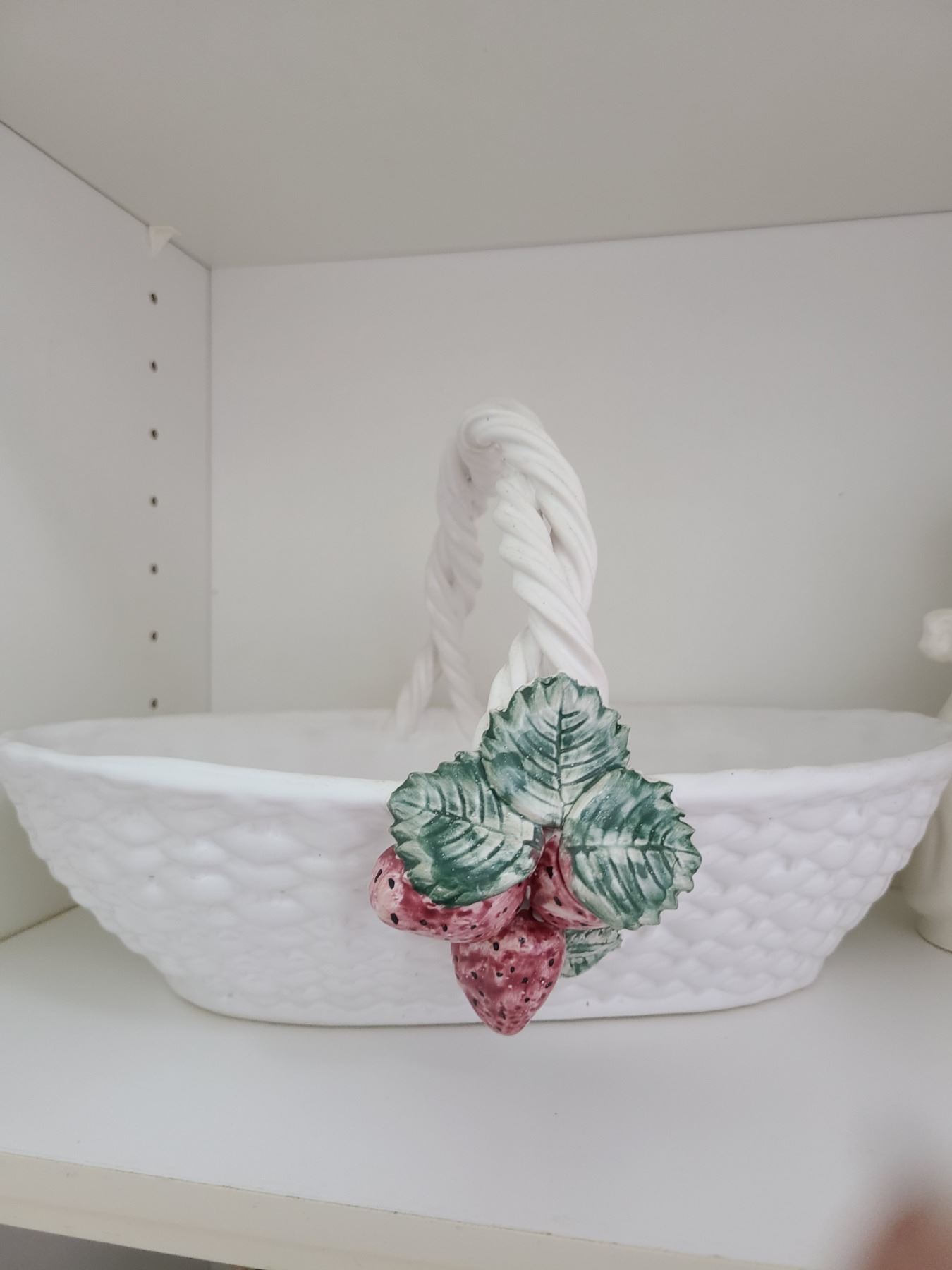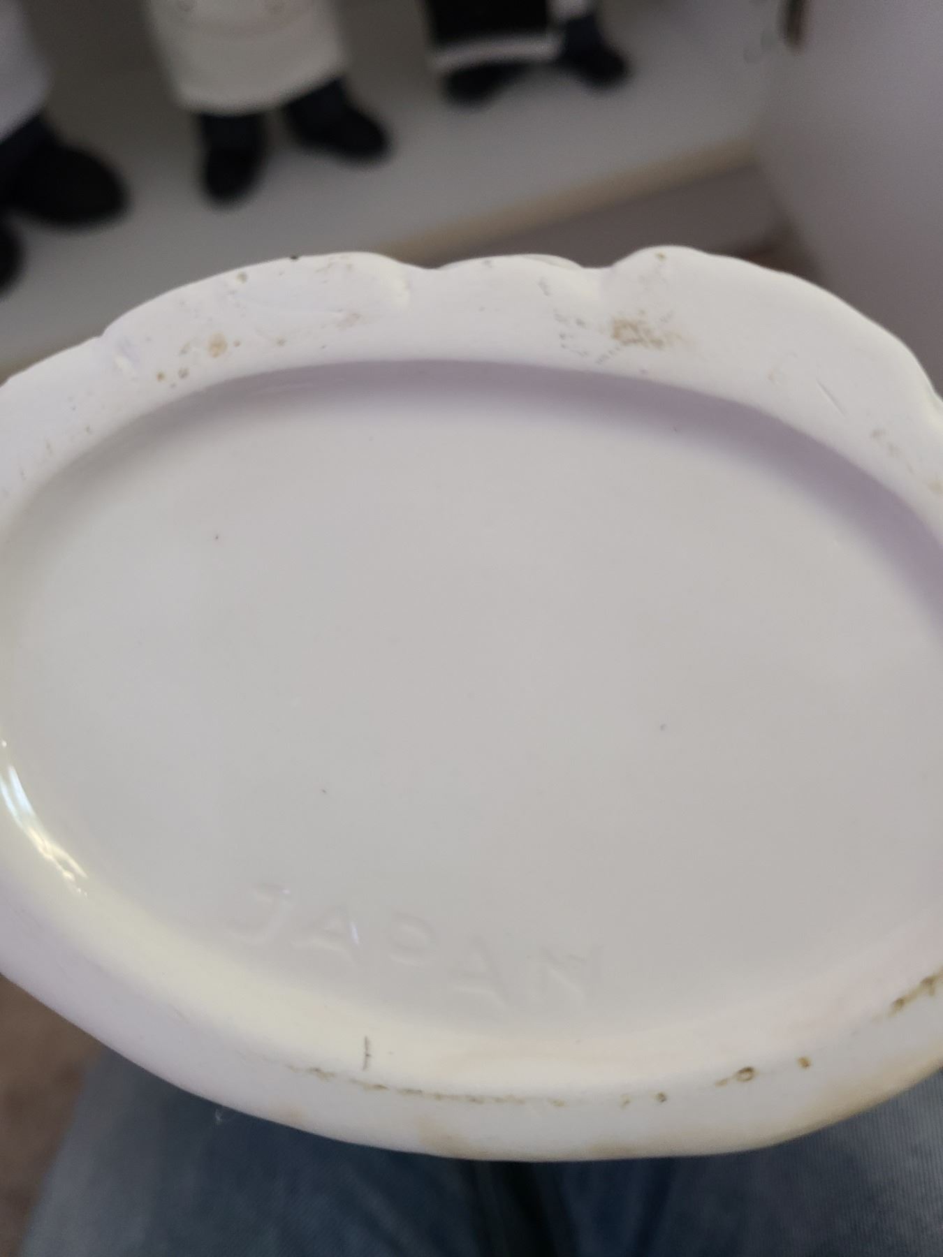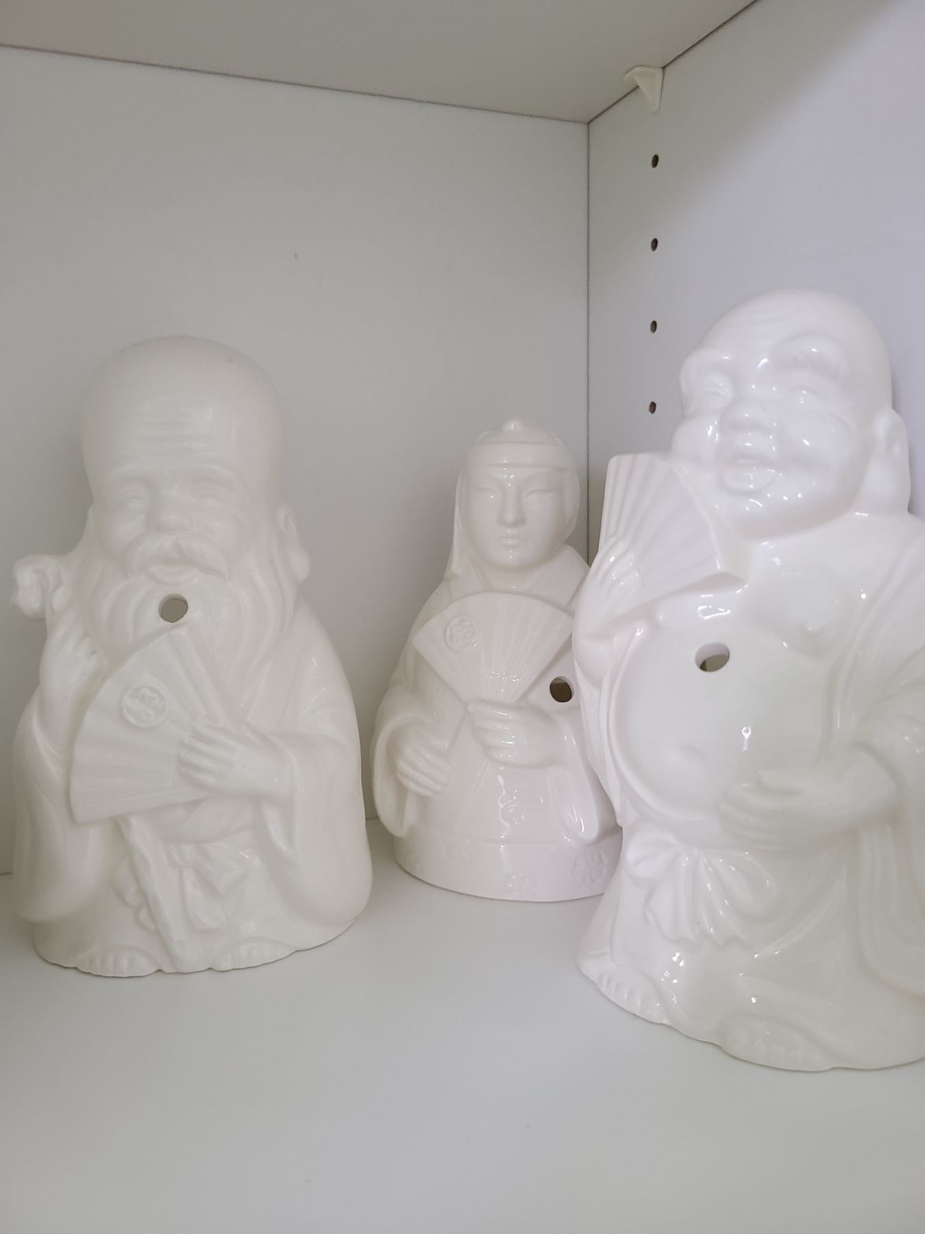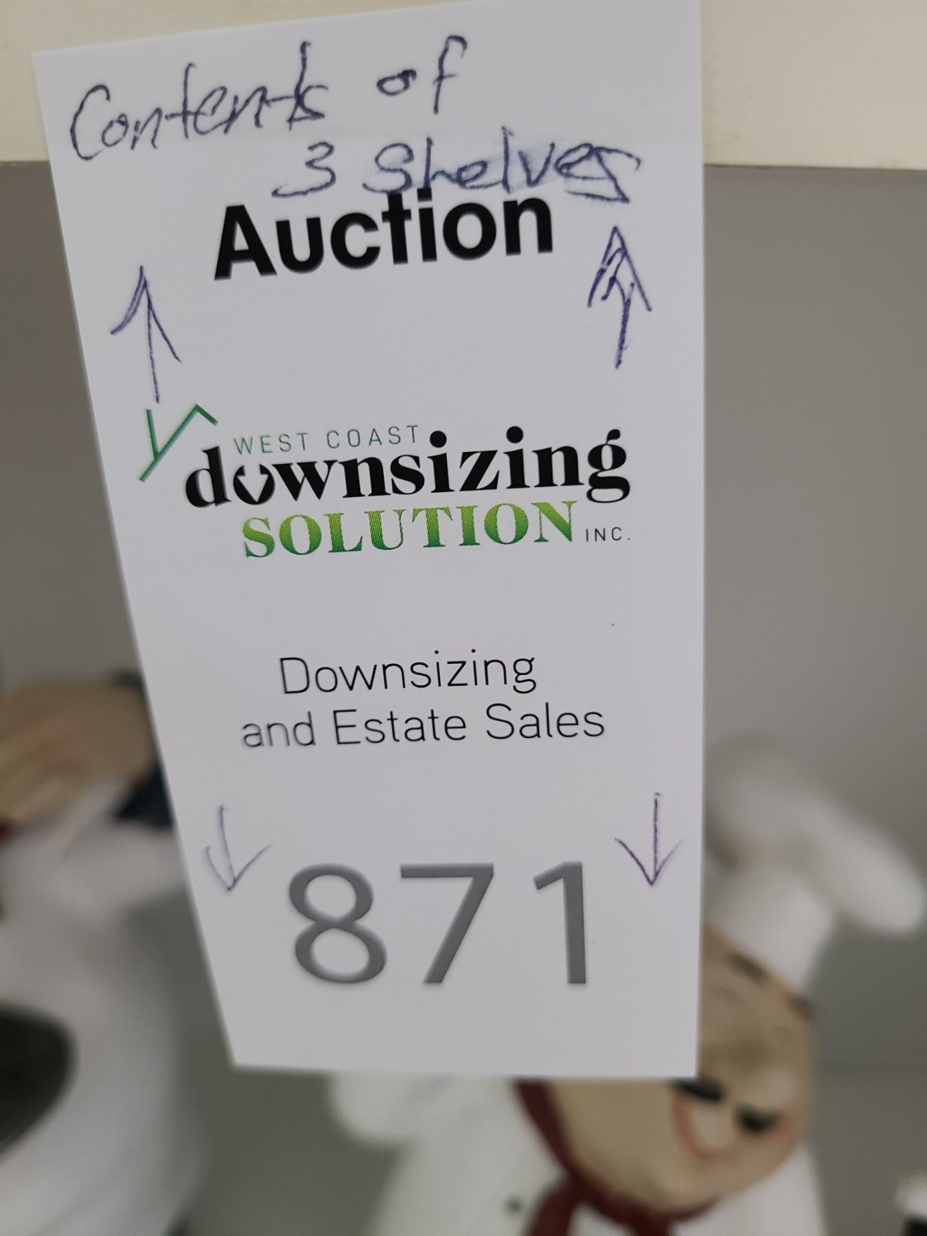 Three shelves of kitchen decor including chefs, large ceramic bowl from Portugal, and three Suehiro characters. Bring packing material. Pickup 9 am.